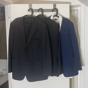 Tre st kavajer. Med två st kostymbyxor Den blåa kostymen så är kavajen Storlek 56 och Byxorna är Large från dressman. Två kavajer som är svarta där ena är strl 58 och andra 54 med svarta kostymbyxor till som är L. Och dem är från HM. En skjorta hänger med i Strl XL. Ni får två hela kostymer plus en kavaj som är likadan fast annan storlek. Perfekt om ni ska testa er fram i kostymvärlden utan att gå över budget. Eller om ni ska ta studenten eller skolavslutning och är på en budget