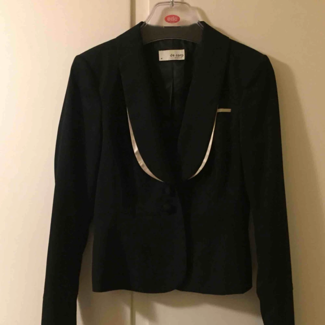 Supersnygg och elegant svart figursydd kavaj från Esprit Urban Casual, de Corp. Fina detaljer, kolla in krage och beslag i beige siden och även hakarna längst ned på baksidan av ärm. Endast använd en gång, som ny.:-)