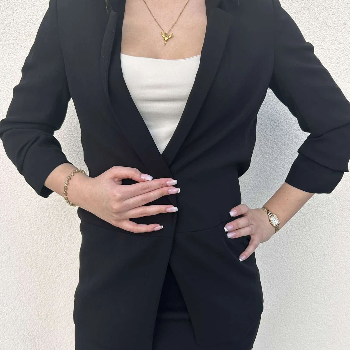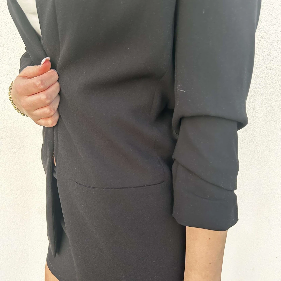Superfin kavaj med trekvartsärmar, passar perfekt till finare tillfällen eller om man ska på någon fest med temat casino eller liknande. Den har ingen knapp i mitten så den är öppen om man inte håller i den. Skicket är suveränt! För referens har modellen vanligen storlek S/M eller 36/38