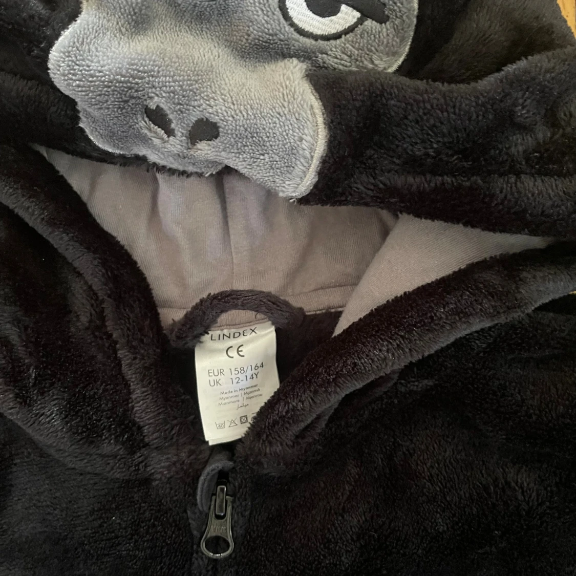 Mjuk och gosig gorilladräkt från Lindex i svart och grå fleece. Dräkten har dragkedja framtill och en huva med broderat gorillaansikte och roliga detaljer som öron och lugg. Perfekt för maskerad eller temakvällar!