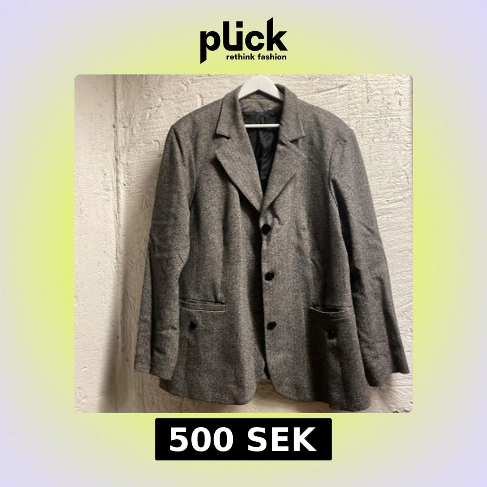 Snygg grå kavaj med klassisk design och knappar framtill. Perfekt för en stilren men lite oversized look. Passar bra till både formella och semi-formella tillfällen. Ull, polyester, silke och elastan