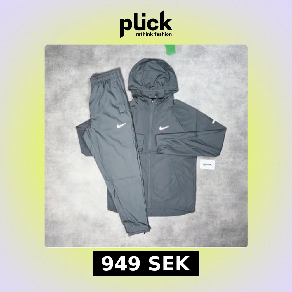 Snyggt grått träningsset från Nike med jacka som har huva och dragkedja samt matchande byxor. Båda plaggen har den klassiska vita Nike-loggan. Perfekt för dig som gillar sportig och clean stil.