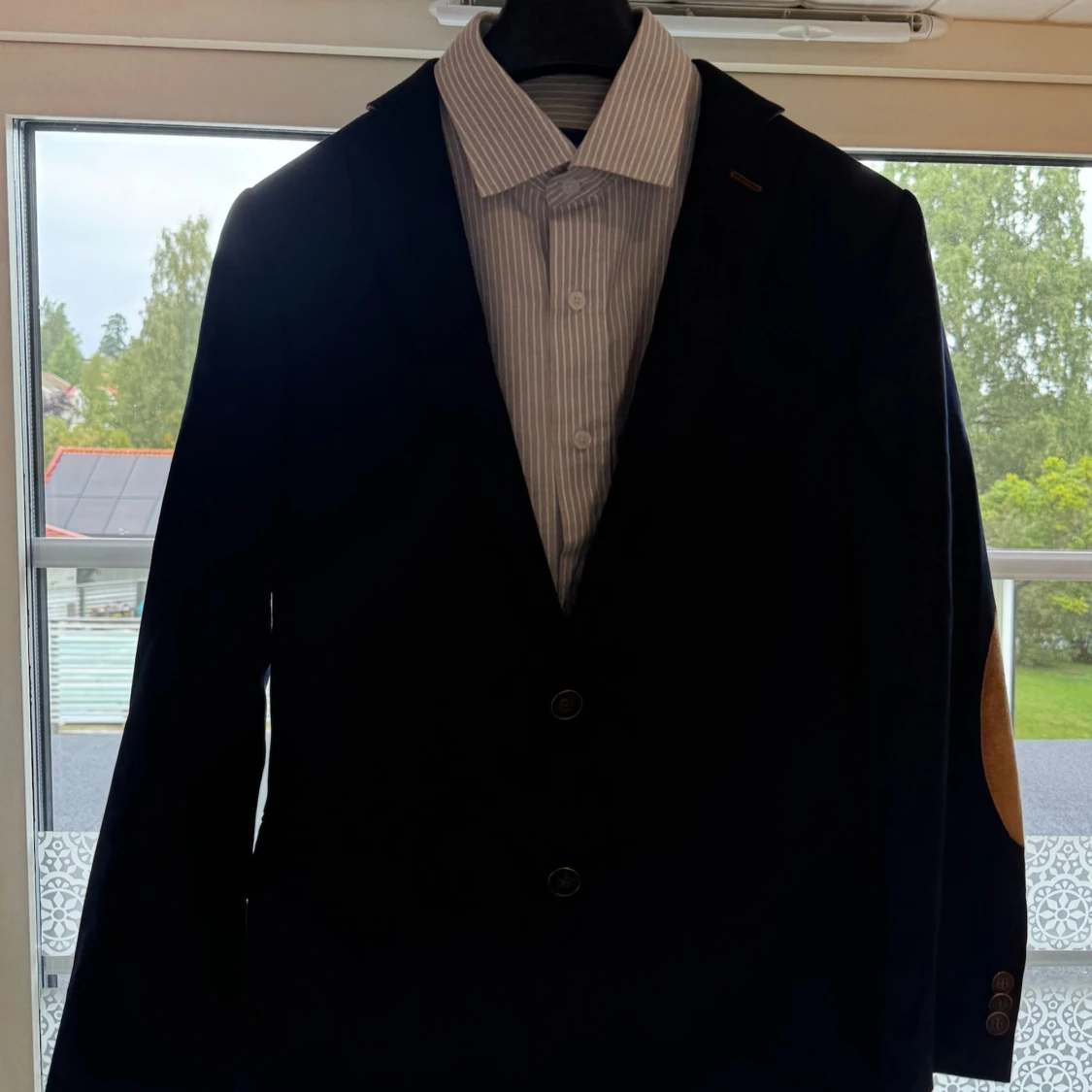 Säljer nu denna skjorta och kavaj tillsammans, kavajen är från Oscar Jacobson och nypriset ligger runt 5000kr, och den här skjortan från barons som kostar mellan 1200-1600kr nypris, de är sköna och perfekta nu! Priset är inte fast utan går att diskutera! Obs kavajen har en blå fläk på insidan som man inte kan se utifrån.