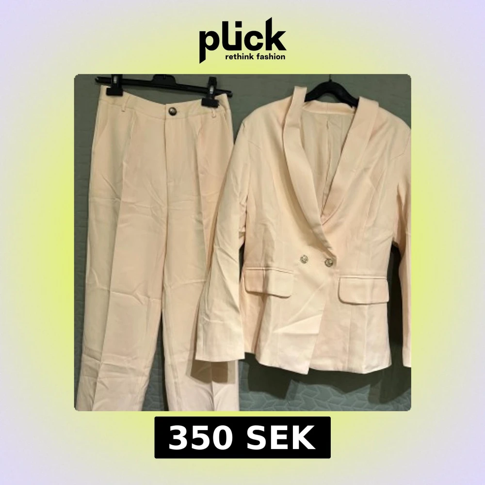 Damkostym i ljus aprikosfärg med klassisk kavaj och raka byxor. Kavajen har dekorativa guldknappar både fram och vid ärmslut. Jätteskönt material. ❕Helt ny. Aldrig använd. Kvar i originalförpackning❕ Kavaj - Längd: ca 68cm, Byst (omkring): ca 96cm, Midja (omkring): ca 96cm. Byxor - Längd: ca 100cm, Midja (omkring): ca 72cm, Benslut (omkring): ca 44cm.
