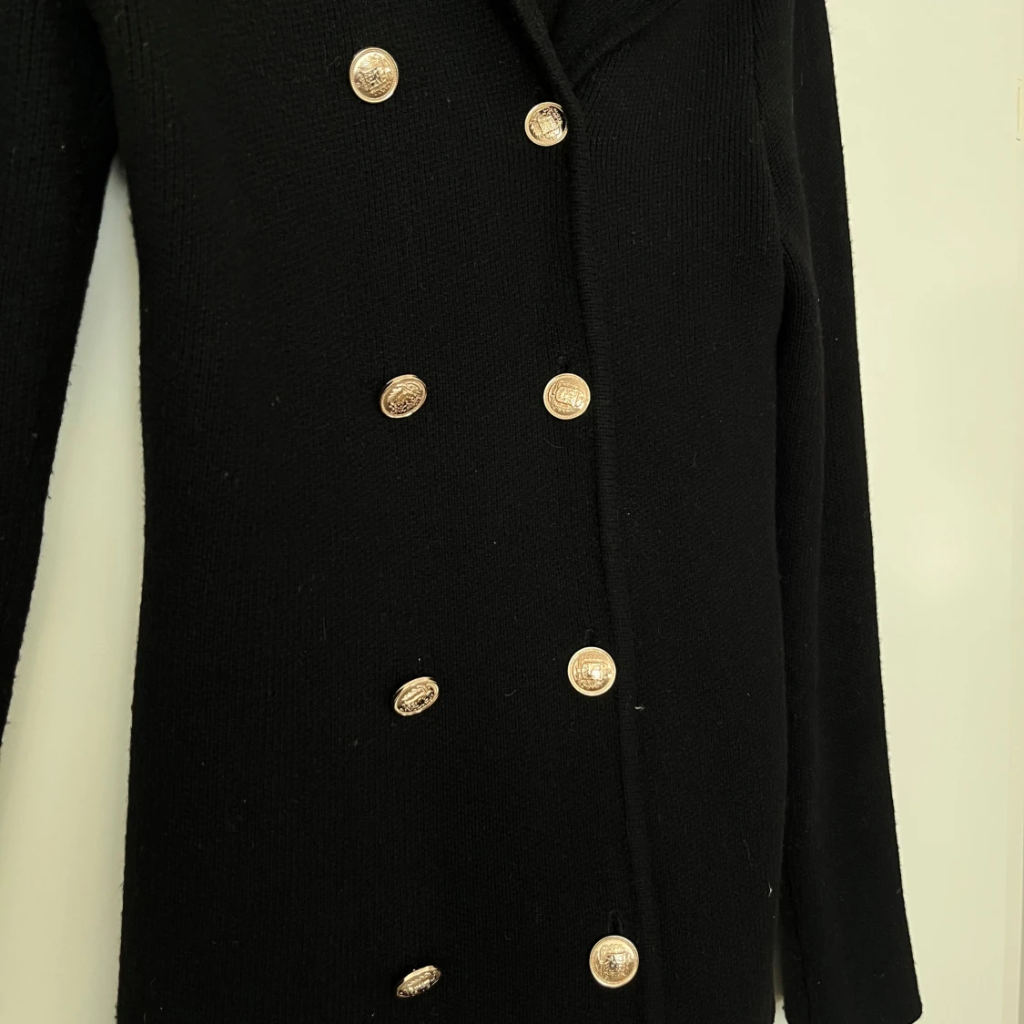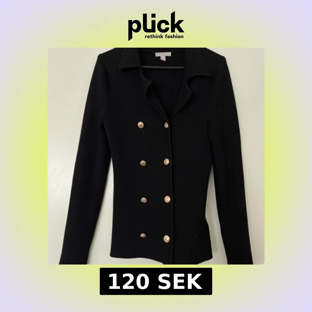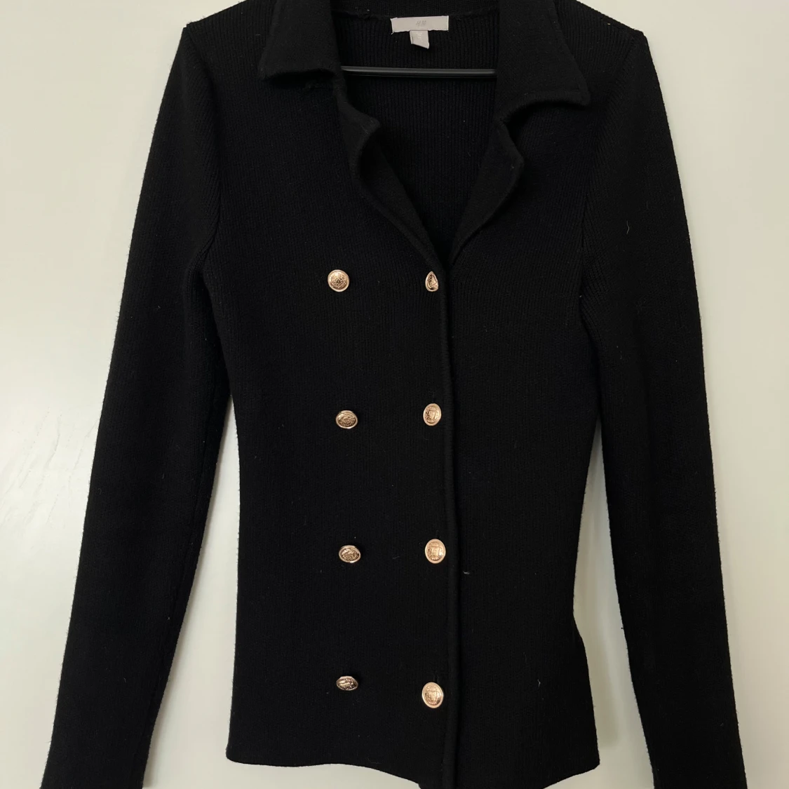 Svart, figursydd kavaj/kofta med dubbelknäppning och guldiga knappar. Elegant modell som passar både till vardags och fest. Köpt från H&M. Storlek XS. I fint skick. 46% viskos, 29% polyester och 25% polyamide. Mått: Längd ca 70 cm Byst ca 32 cm Midja ca 32 cm Ärmlängd mätt från axeln ca 65 cm Axelmått ca 40 cm