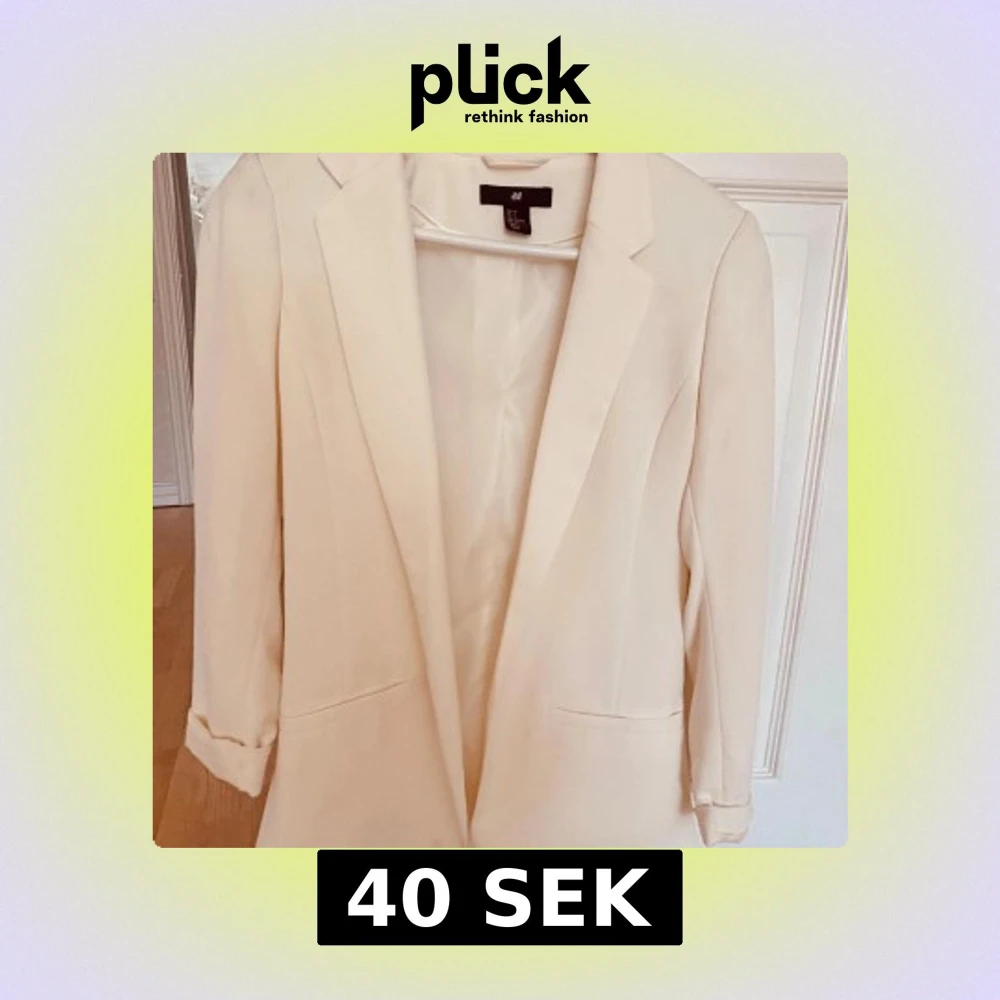 Snygg vit kavaj från H&M i storlek 36. Klassisk modell med smal krage, två fickor fram och helfodrad insida. Stilren och enkel design som ger en fräsch look. Perfekt att matcha med jeans eller kostymbyxor för en clean vibe.