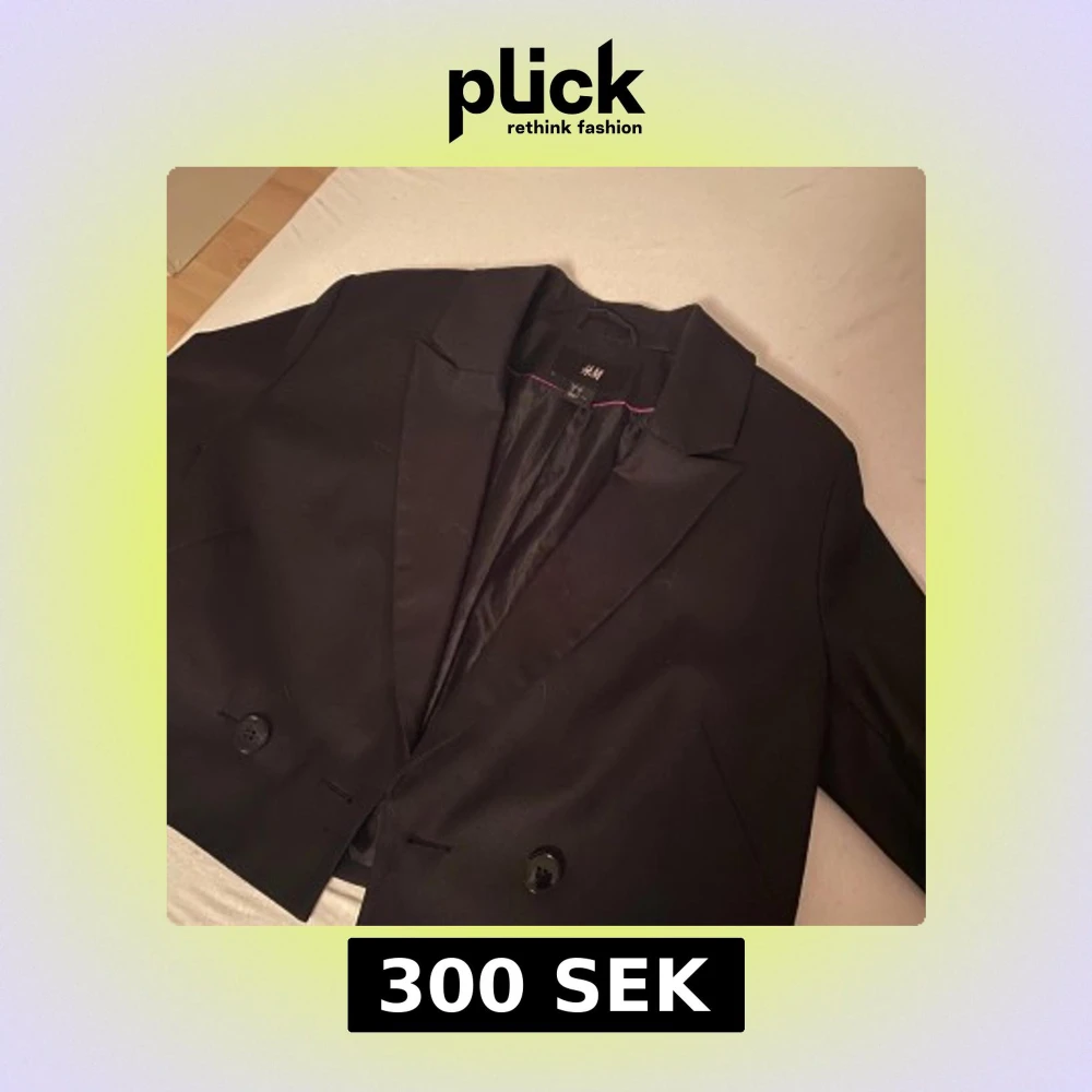 Snygg svart kavaj från H&M i klassisk modell med två knappar framtill och smal krage. Kavajen har en stilren look och är fodrad med svart tyg på insidan. Perfekt för dig som gillar en enkel och clean stil. Aldrig använt och det vita e liksom nåhot från luften det tar man bort lätt. Köpte för 500 kr