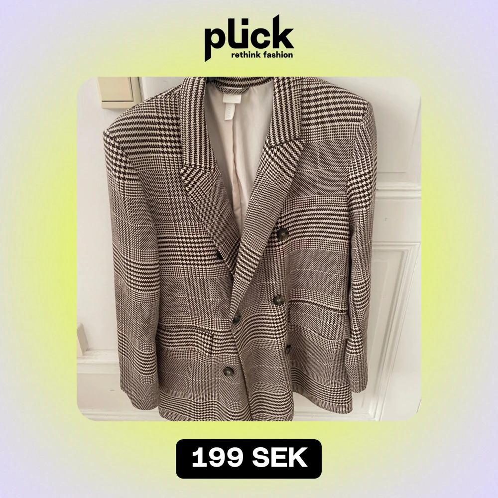 Snygg rutig kavaj i brunt och svart med klassisk design. Den har en dubbelknäppt stil med stora knappar och långa ärmar. Perfekt för höst och vår, och funkar både till vardags och fest. Kavajen är i mycket bra skick och ger en stilren look.
