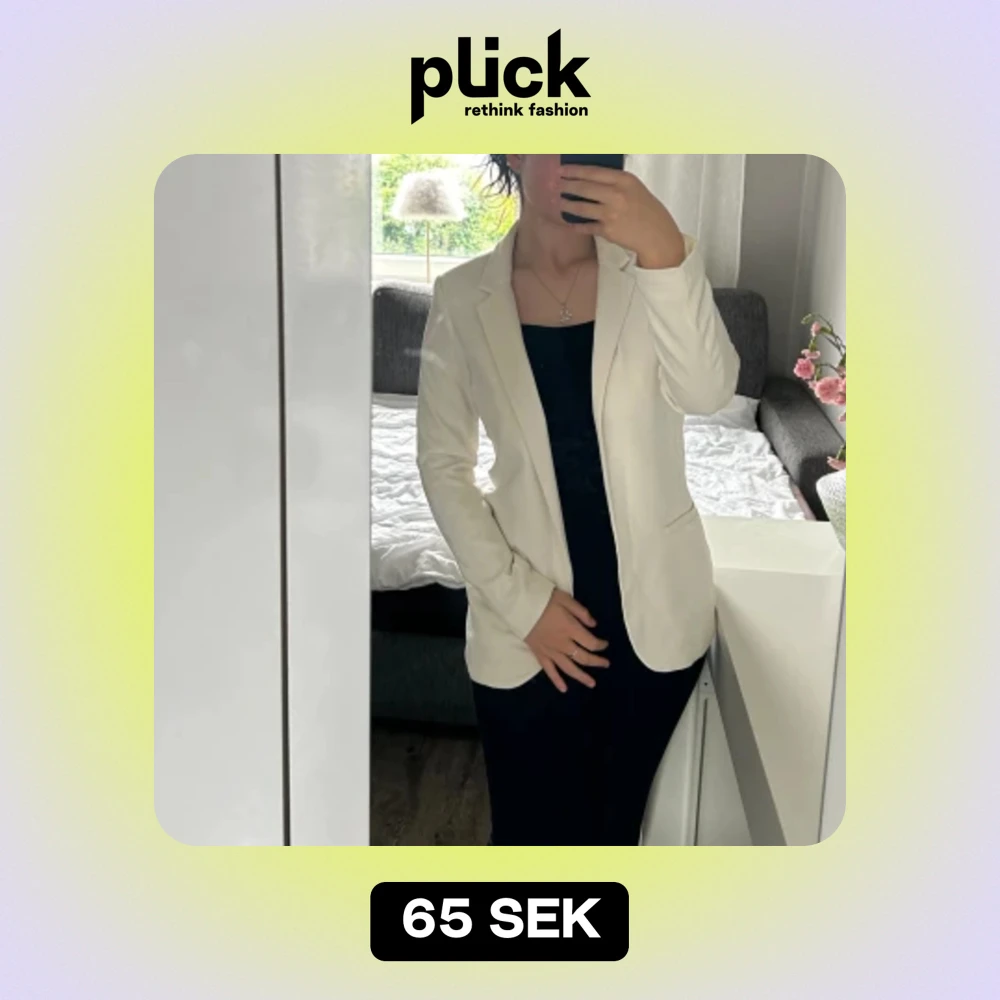 Den är INTE helt vit utan krämvit/beige. Jättefin passform & ser väldigt elegant ut. Använd några gånger.
