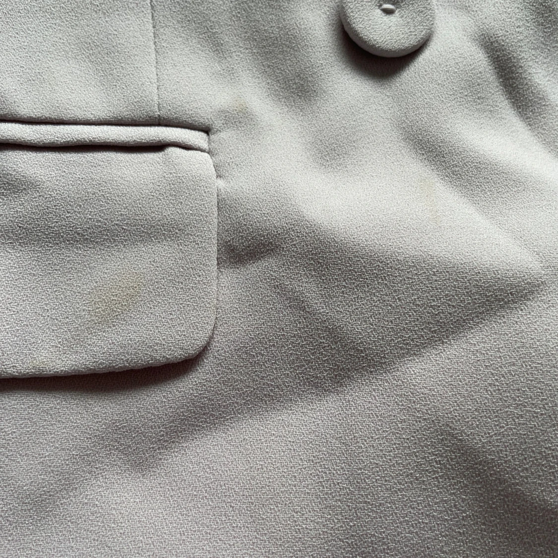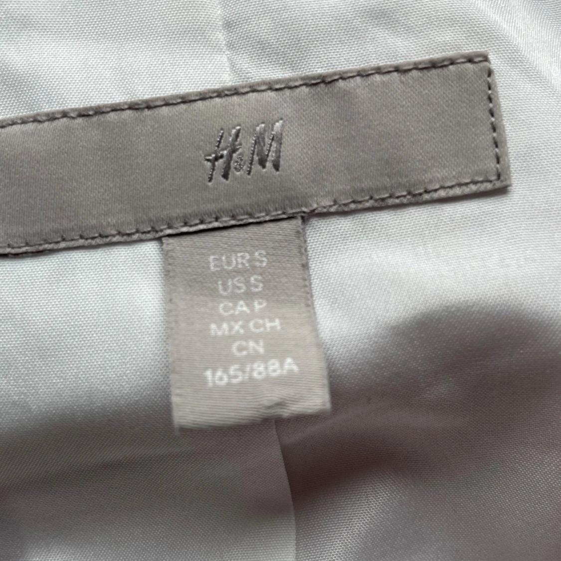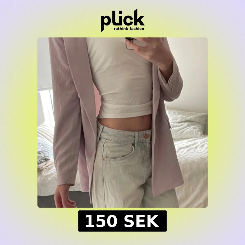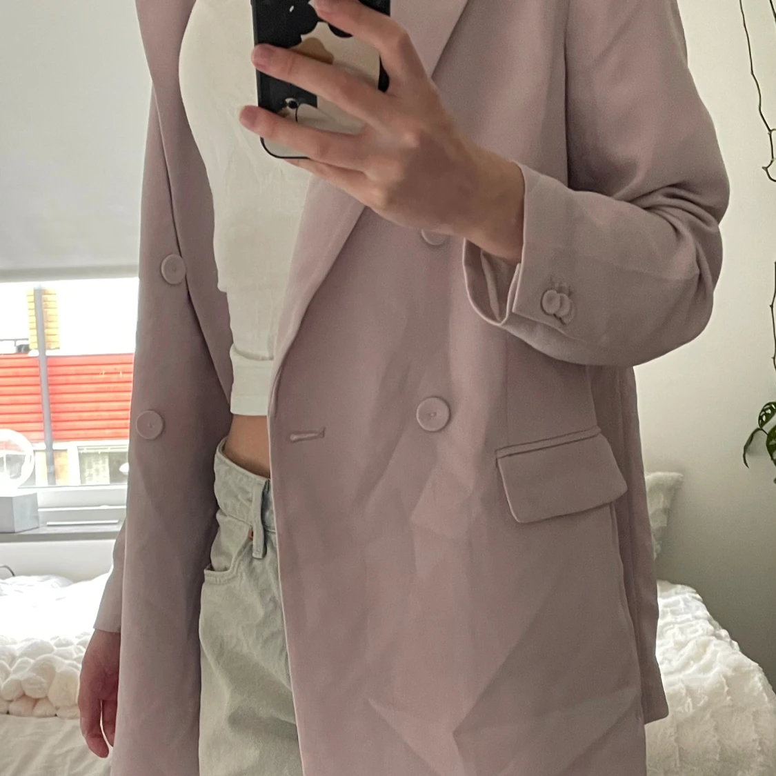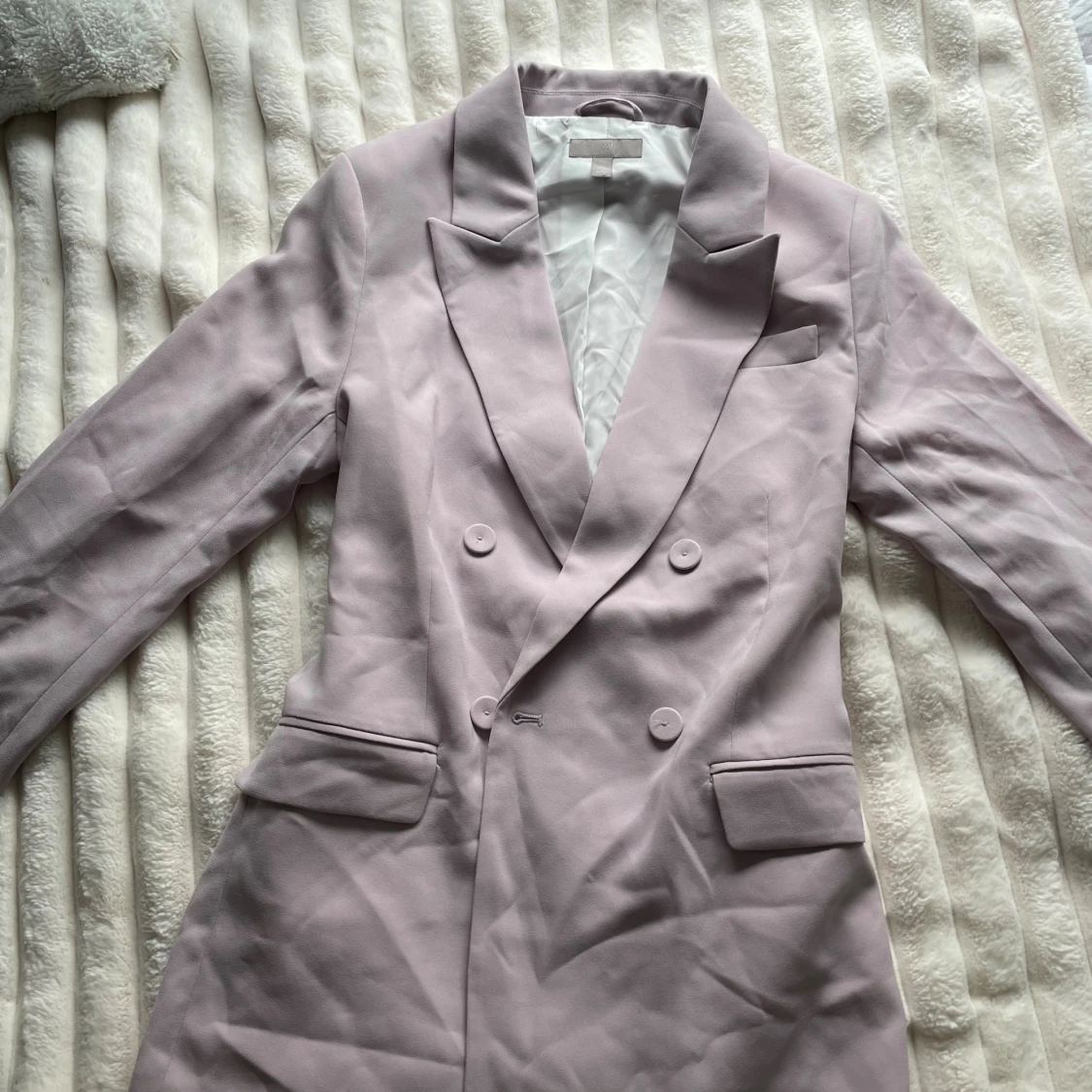 Dubbelknäppt kavaj från H&M i en snygg ljuslila färg. Klassisk modell med två framfickor, en liteb slits på baksidan och knappar i samma ton som tyget. Bara använd 1 gång på ett bröllop. Den har en fläck vid höger ficka som knappt är synlig (sista bilden).