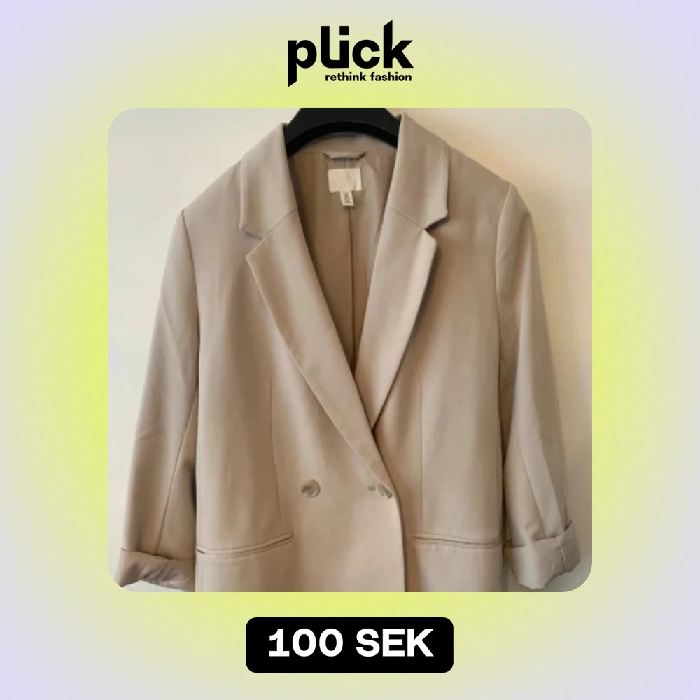 Beige kavaj/blazer från H&M. Nyskick, Använd 1 gång. Vadderade axlar. Strl S. Lång/lite oversize, passar även de som har M. Kan mötas upp i Stockholm och Uppsala.