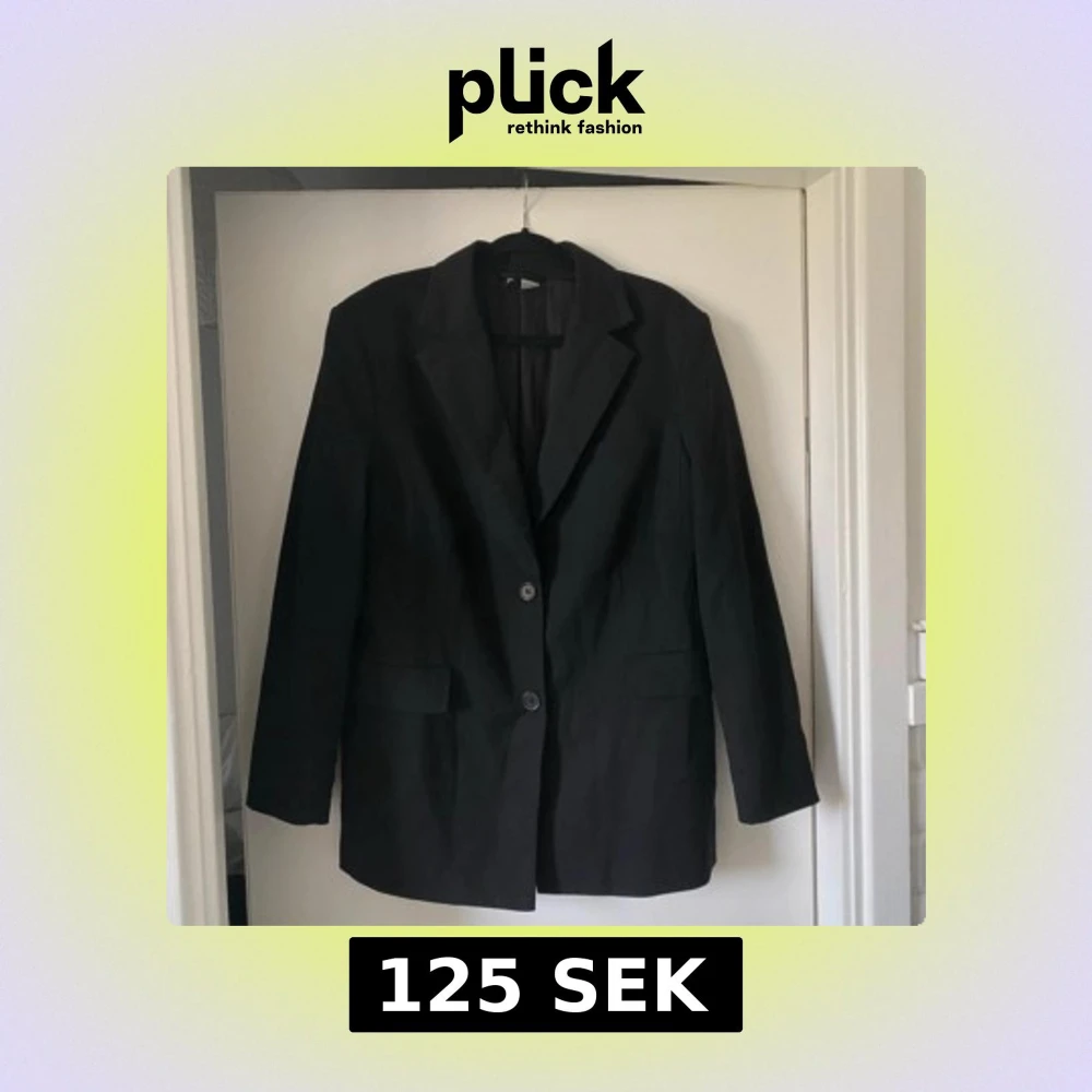 Stilren svart kavaj med klassisk krage och två knappar framtill. Tillverkad i en mix av polyester, viskos och elastan för en bekväm passform. Kavajen har raka ärmar och två fickor med lock. Perfekt för en snygg och enkel look.