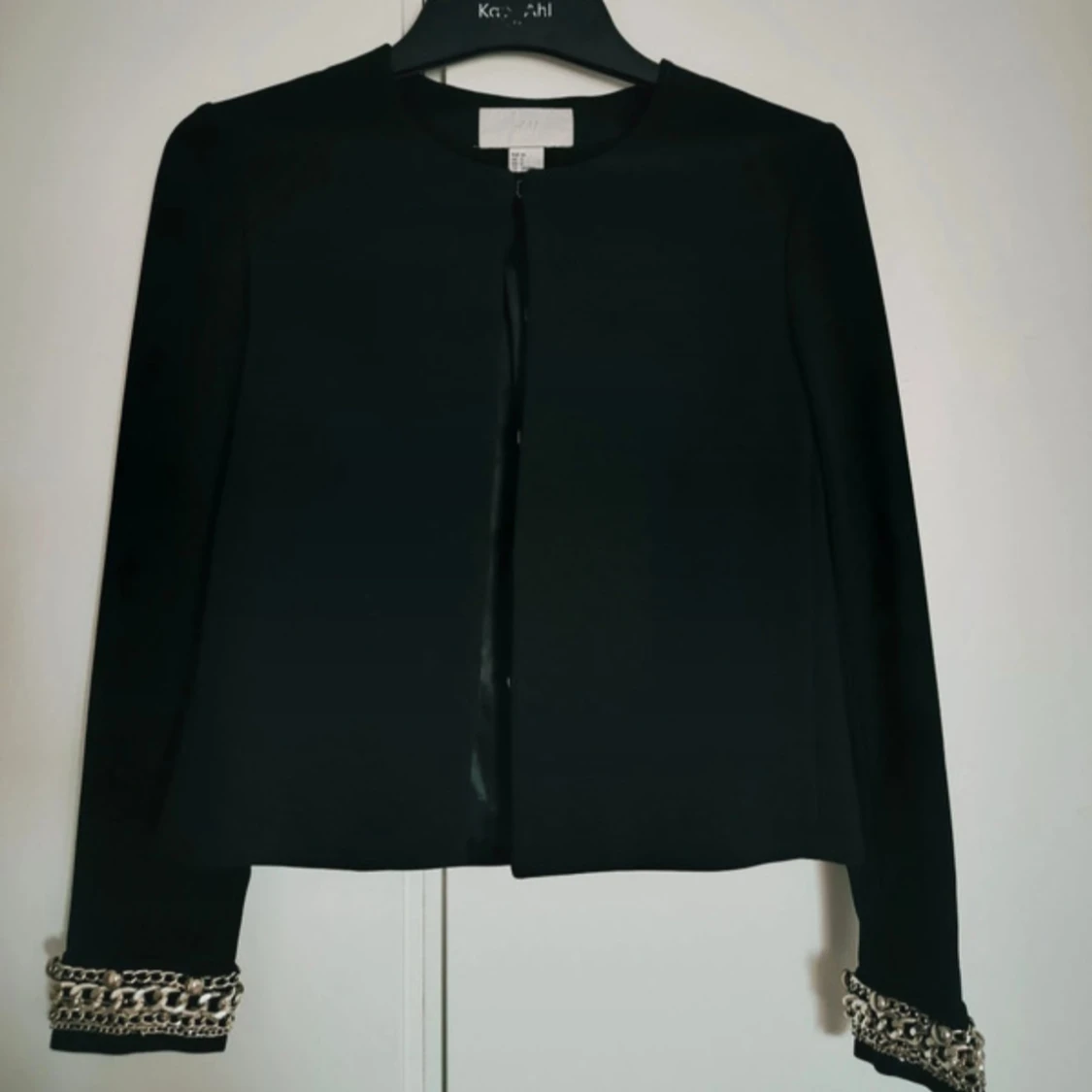 Snygg svart kavaj från H&M med lång ärm och rund halsringning. Ärmsluten är dekorerade med silvriga kedjor som ger en cool touch. Perfekt för dig som vill sticka ut lite extra. Stängs framtill utan synliga knappar.