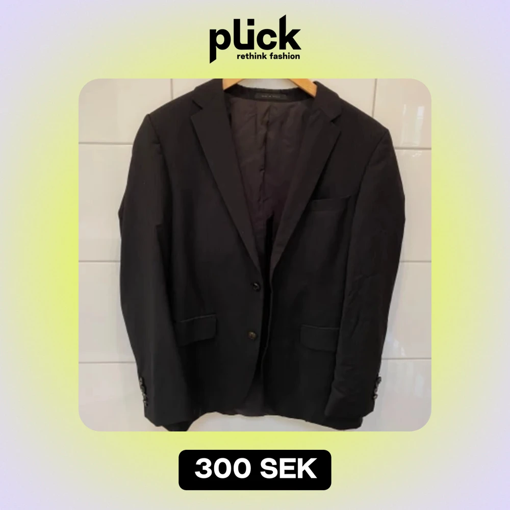 Använd endast några gånger. Fint skick. Kan ej se storleken men passar om du har storlek S (möjligt storlek M). Jag har storlek M/L och den sitter lite tight på mig. Se bild. Svart kavaj med tunna ränder.