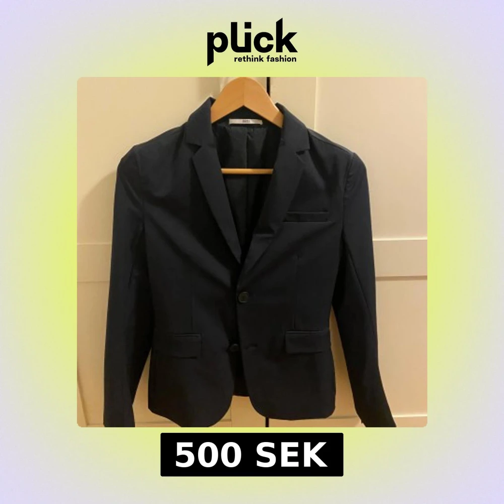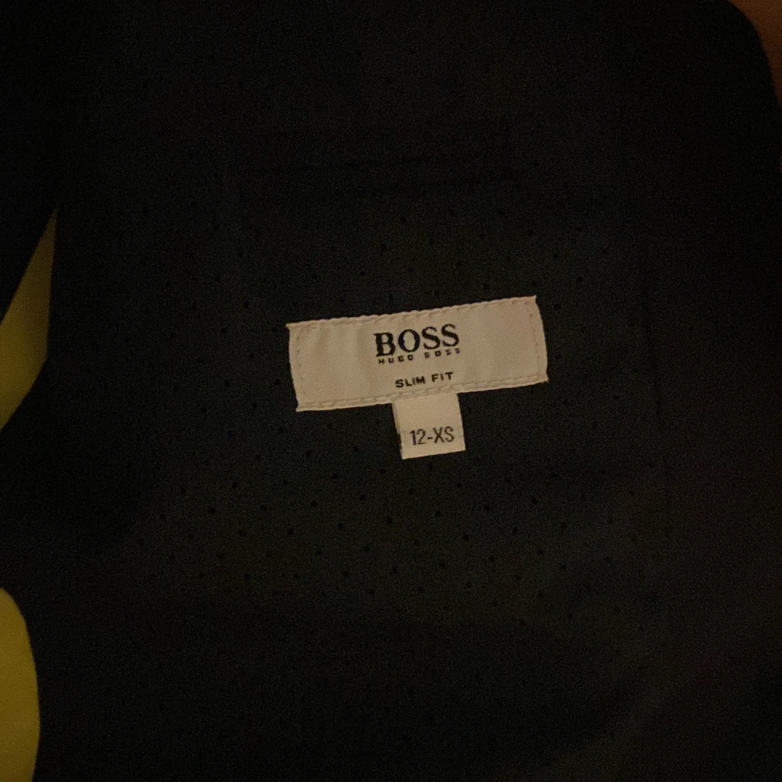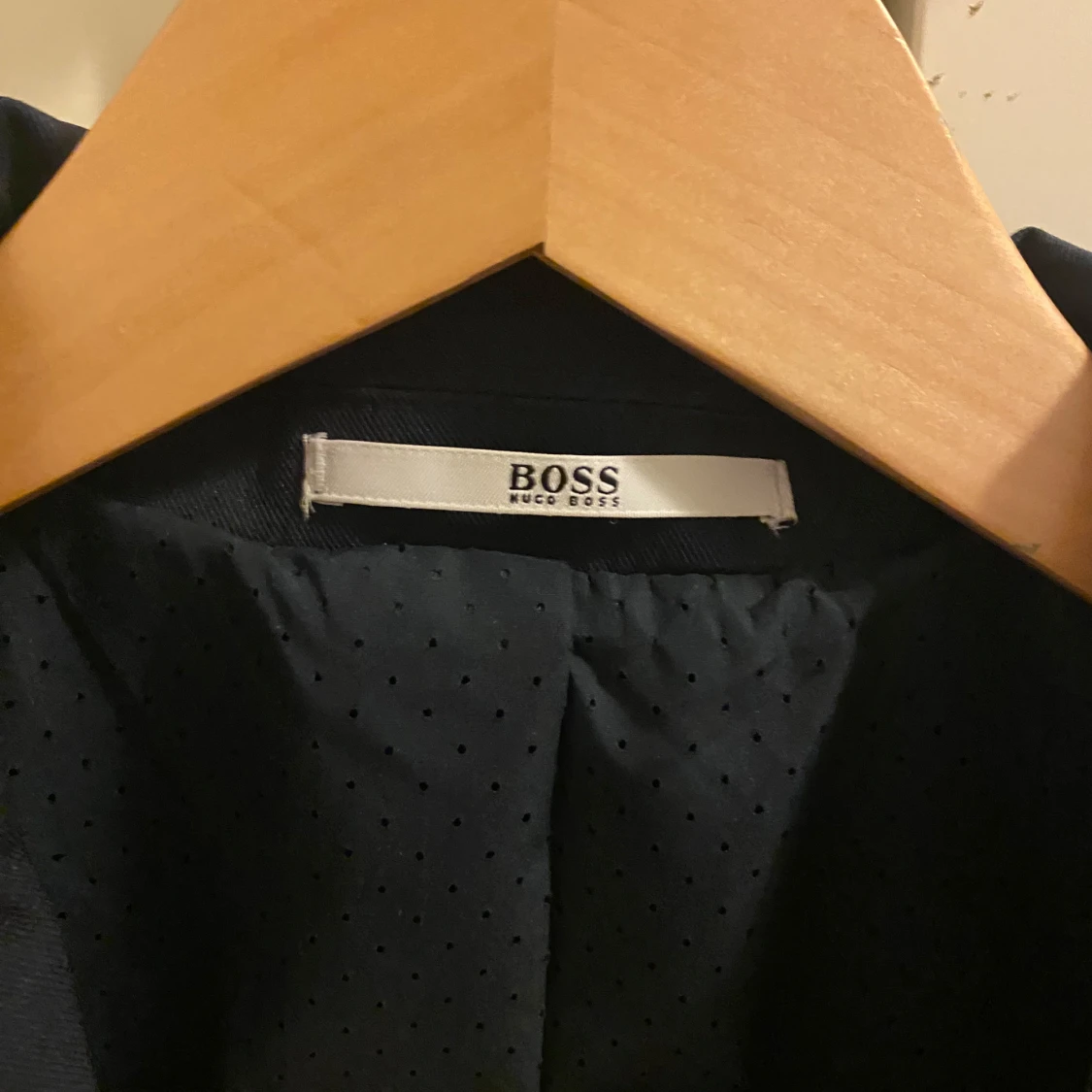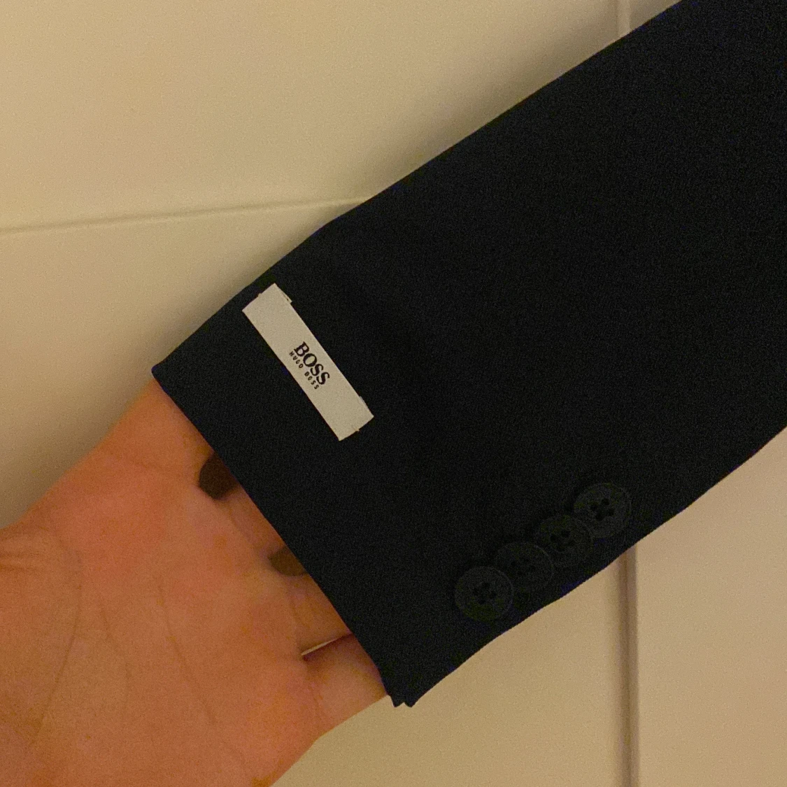Snygg mörkblå kavaj från Hugo Boss i slim fit-modell. Klassisk design med två knappar framtill, tre fickor och diskreta knappar vid ärmslutet. Perfekt för dig som vill ha en stilren och modern look. Fodrad insida med små prickar för extra detalj.