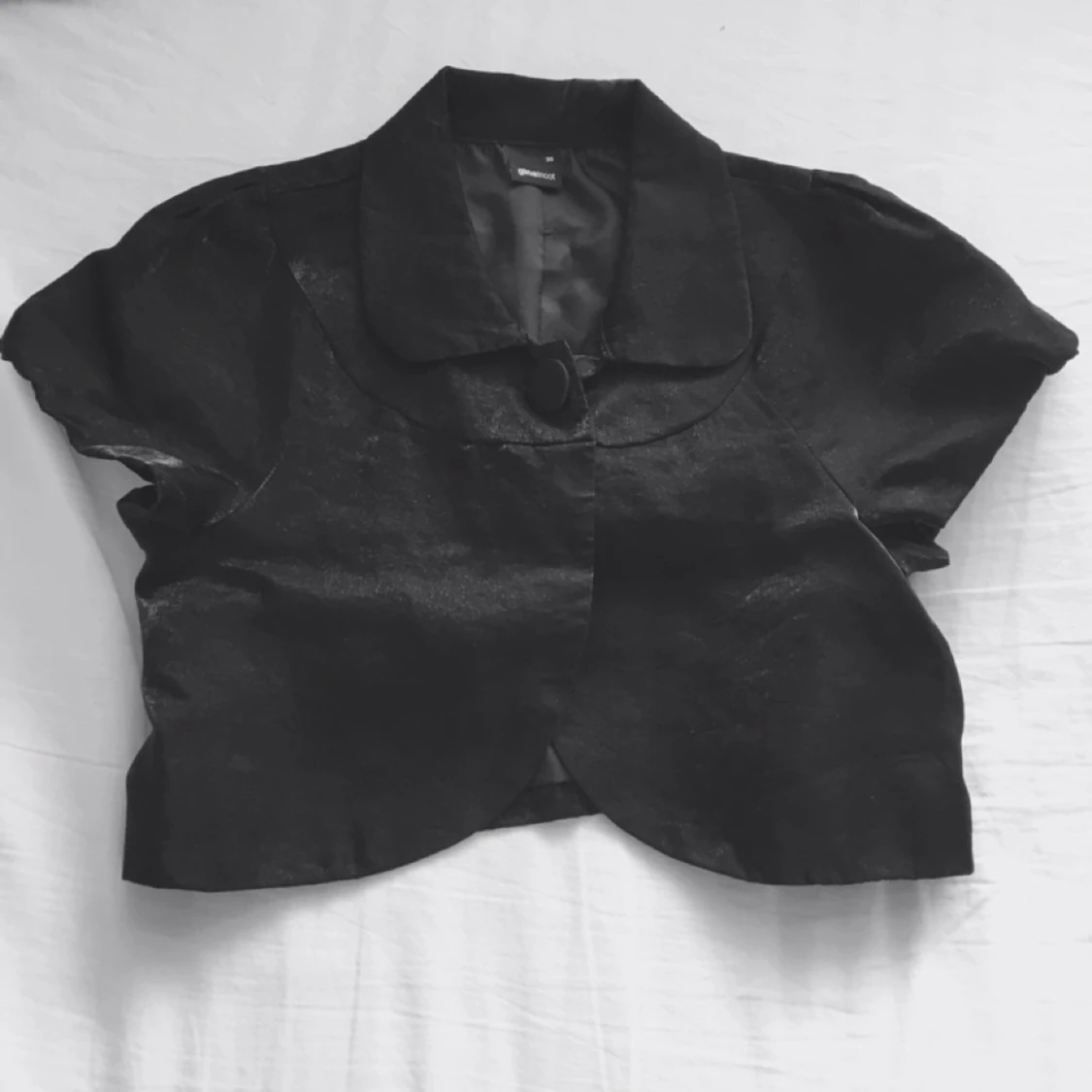 En söt liten kortärmad svart jacka i skimrande tyg❤️ passar jättebra till en fin klänning på kvällen 👌🏾