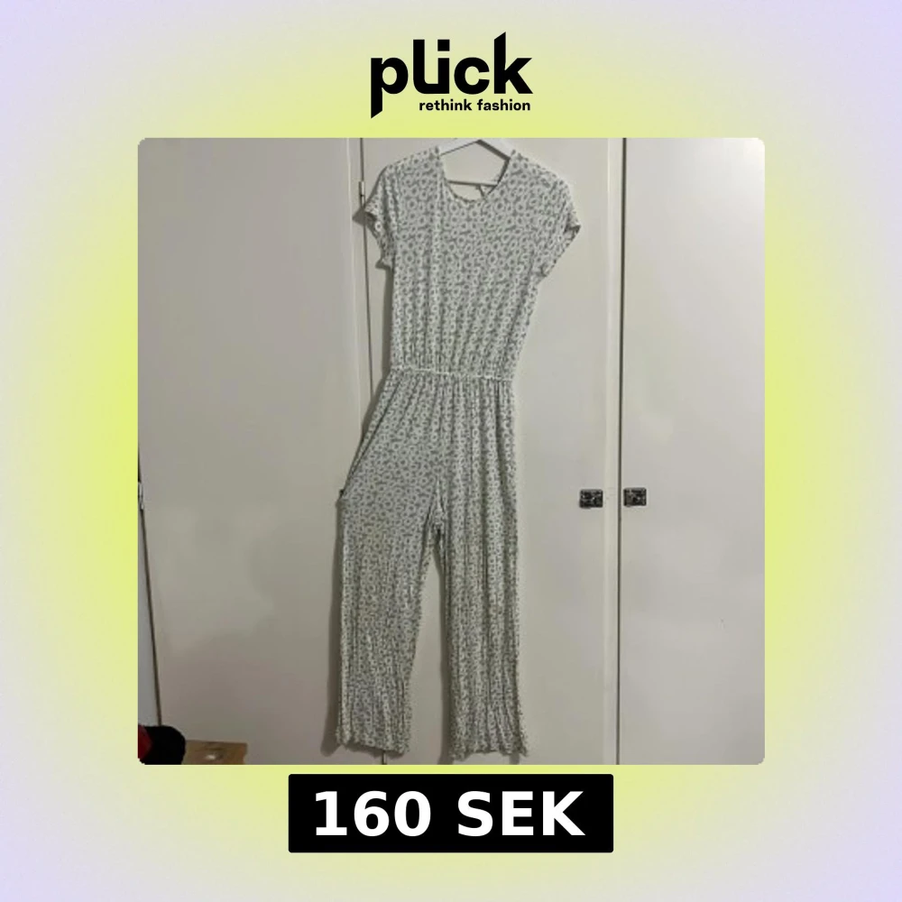 Supersöt jumpsuit från Kappahl i storlek 164. Ljusgrön och vit med blommigt mönster, korta ärmar och v-ringad rygg. Mjuk och skön i bomull, med resår i midjan för en snygg passform. Perfekt för dig som gillar avslappnad och trendig stil.