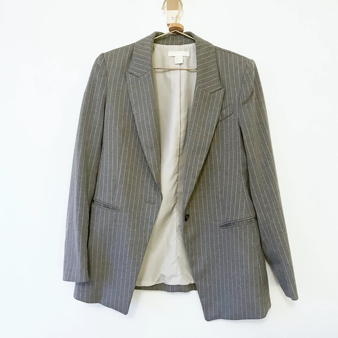 En kavaj med grå bas och vita kritstrecksränder på. Superfin och i storlek 36 men passar också en 38🌻