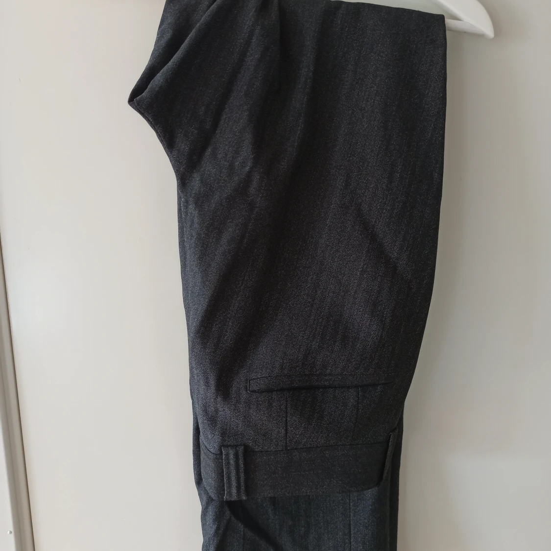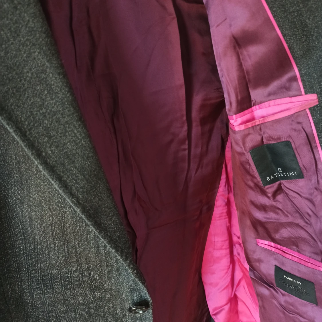 Grå, fin kostym i bra skick. Säljer för att den inte passar. Randig textur. Märke: Batistini