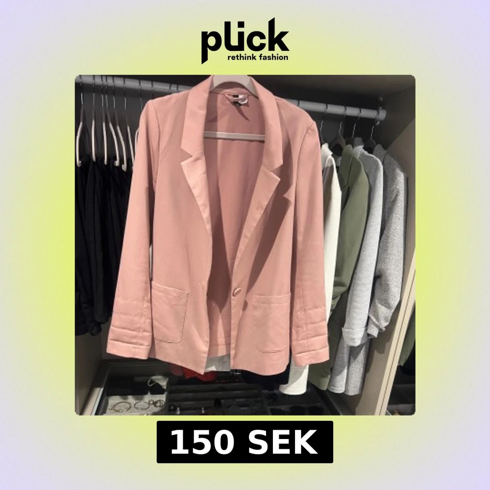Snygg ljusrosa kavaj med klassisk krage och två stora fickor framtill. Enkelknäppt design och raka ärmar med diskreta sömmar vid mudden.