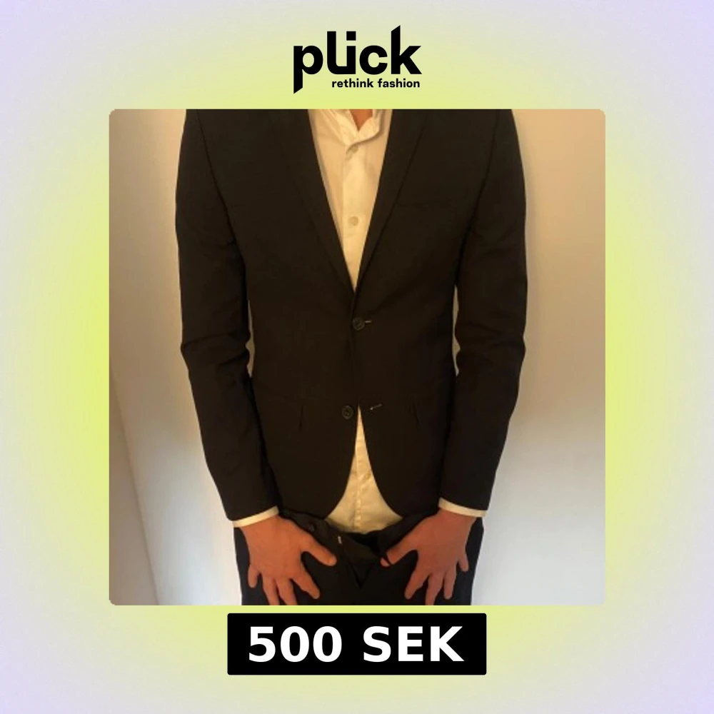 Säljer en mörkblå kostym med kavaj från H&M i slim fit och matchande kostymbyxor från Dressmann, även de i slim fit. Klassisk design med två knappar på kavajen och raka byxben. Perfekt för dig som vill ha en stilren och modern look.