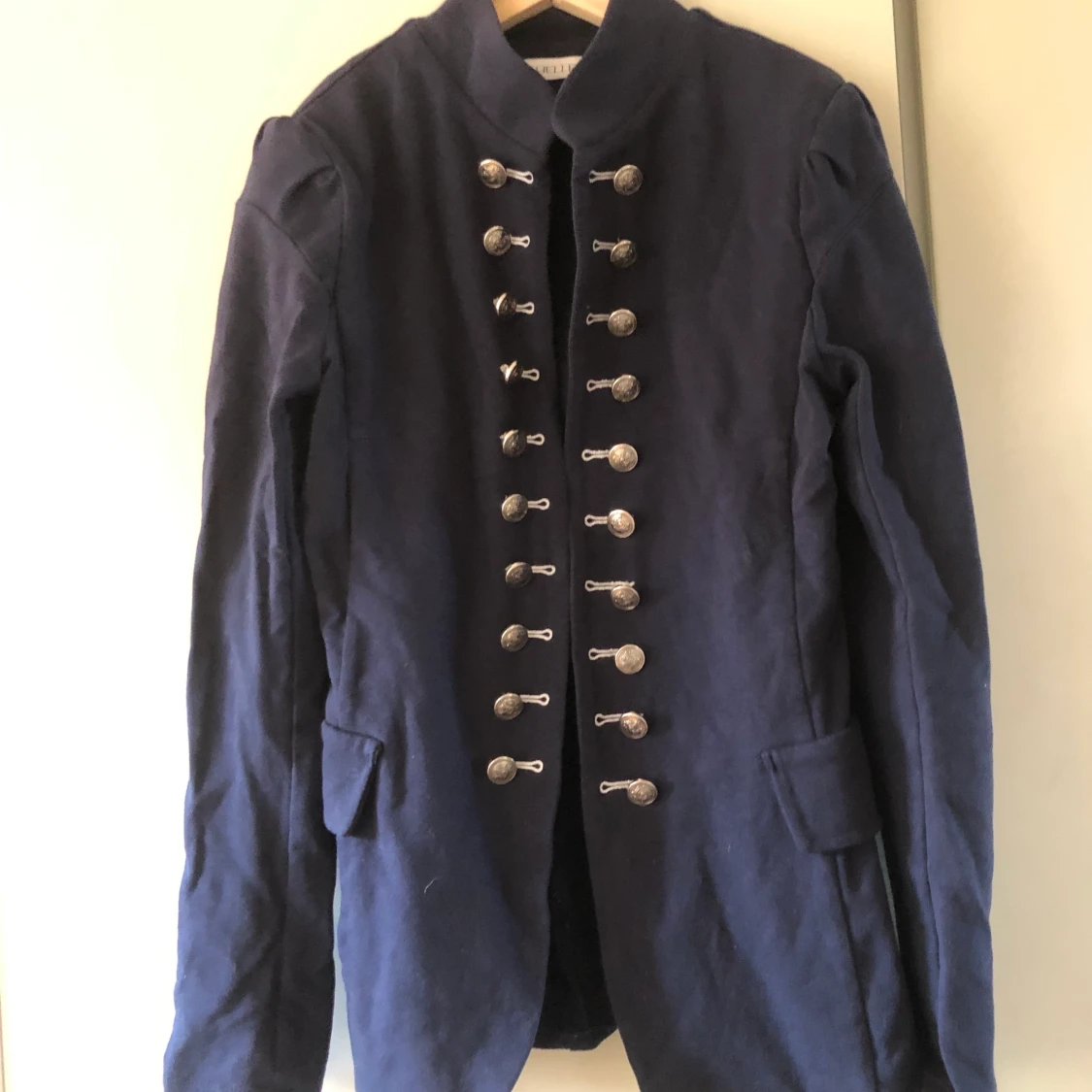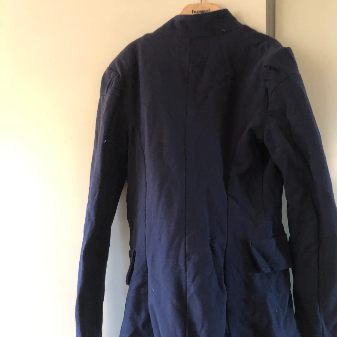 En marinblå ”dam kavaj” i storlek S. Den kom tyvärr aldrig till användning.