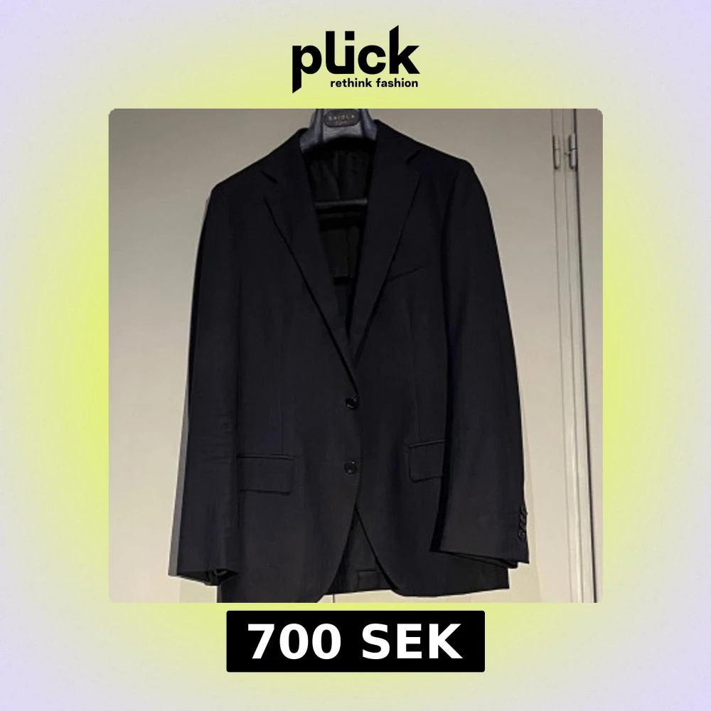 Mörkblå kostym med diskreta ränder från Gaiola. Kostymen har en klassisk design med två knappar och fickor fram. Skick 7/10. Storlek 46