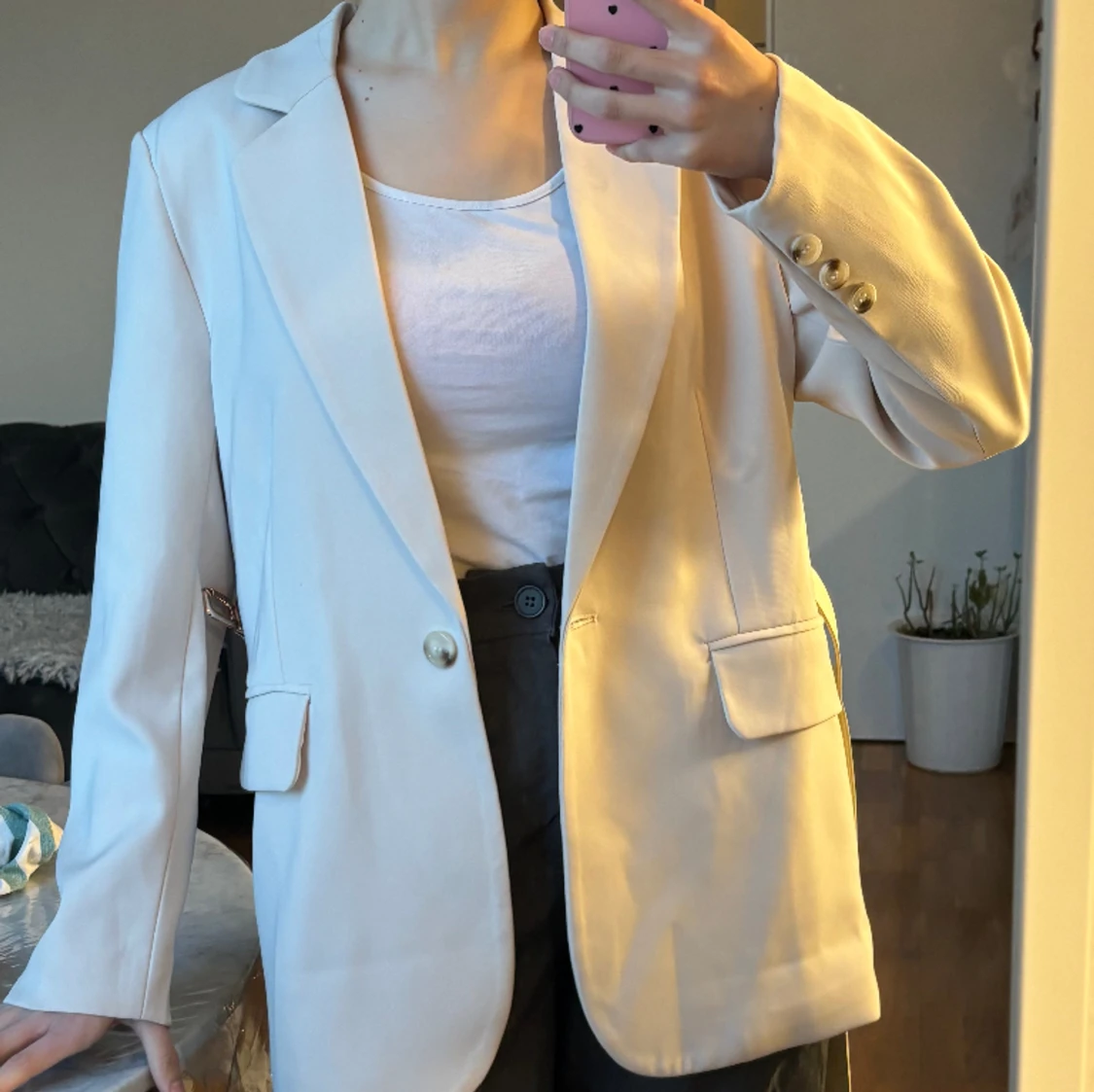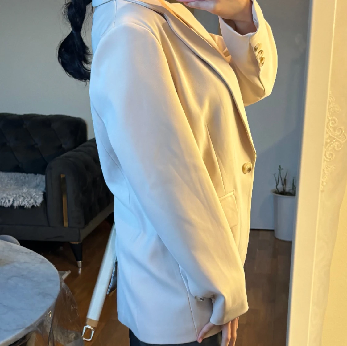Beige kavaj i nytt skick, aldrig anvÀnt. Köpte den för 700kr. En bÀlte medföljer.
