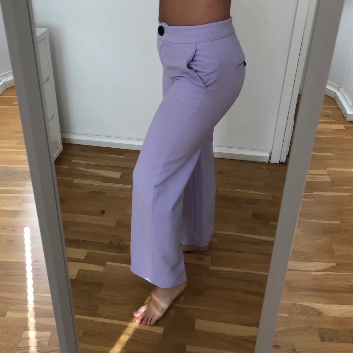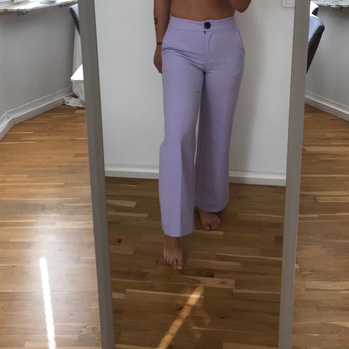 Riktigt snygga kostymbyxor som sitter som en smĂ€ck runt midjan! Passar perfekt till en simpel vit t-shirt! đ Strl Ă€r 34(XS) men passar pĂ„ mig som Ă€r 36(S) har en foundation flĂ€ck som inte gĂ„r bort men som knappt syns!