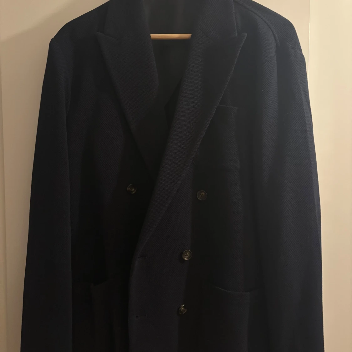 Snygg mörkblå kavaj från John Henric i storlek L. Dubbelknäppt med klassisk krage och fickor framtill. Tillverkad i 100% bomull med slät insida. Perfekt för dig som gillar stilrena och tidlösa plagg.