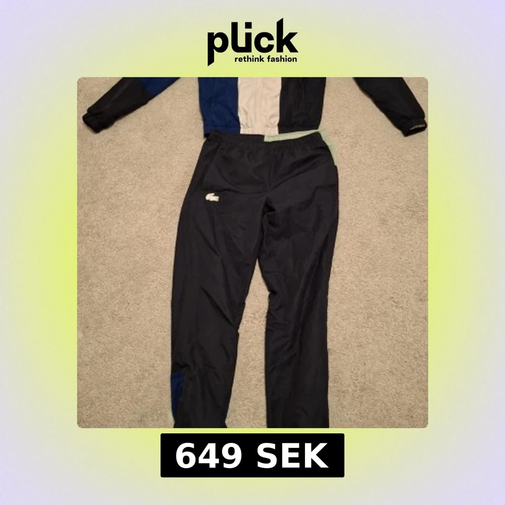 Snyggt träningsset från Lacoste med jacka och byxor i blått, svart, ljusgrönt och vitt. Jackan har dragkedja, meshfoder och logga på ärmen. Byxorna har elastisk midja och klassisk Lacoste-logga. Perfekt för dig som gillar sportig stil.PRIS KAN DISKUTERAS.