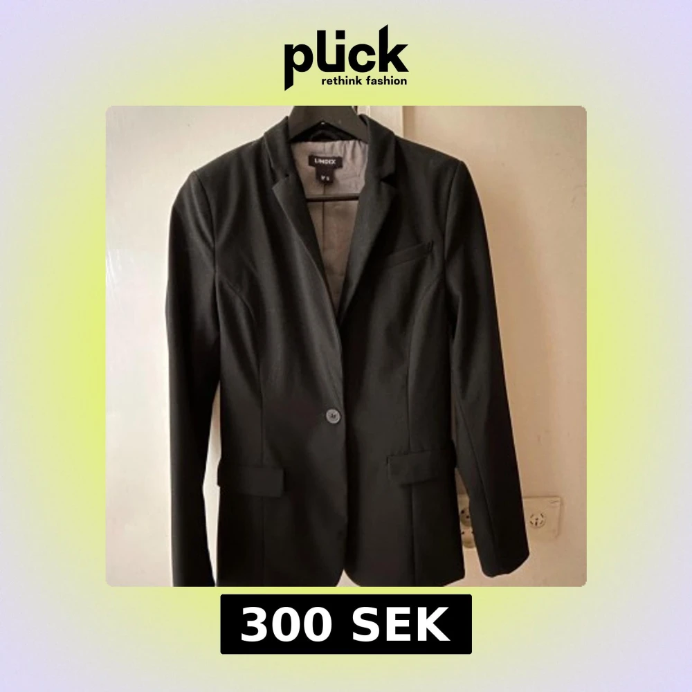Klassisk svart kavaj från Lindex i storlek 36 Enkelknäppt modell med två fickor fram och en bröstficka. Snygg passform med figursydd siluett och helfodrad insida. Perfekt att styla med skjorta eller t-shirt för en clean look.