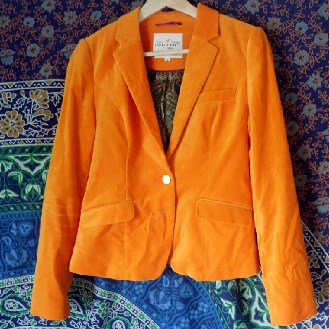 Fräck kavaj i orange sammetsmaterial. Snyggt foder och guldknappar. Bara använd en gång!