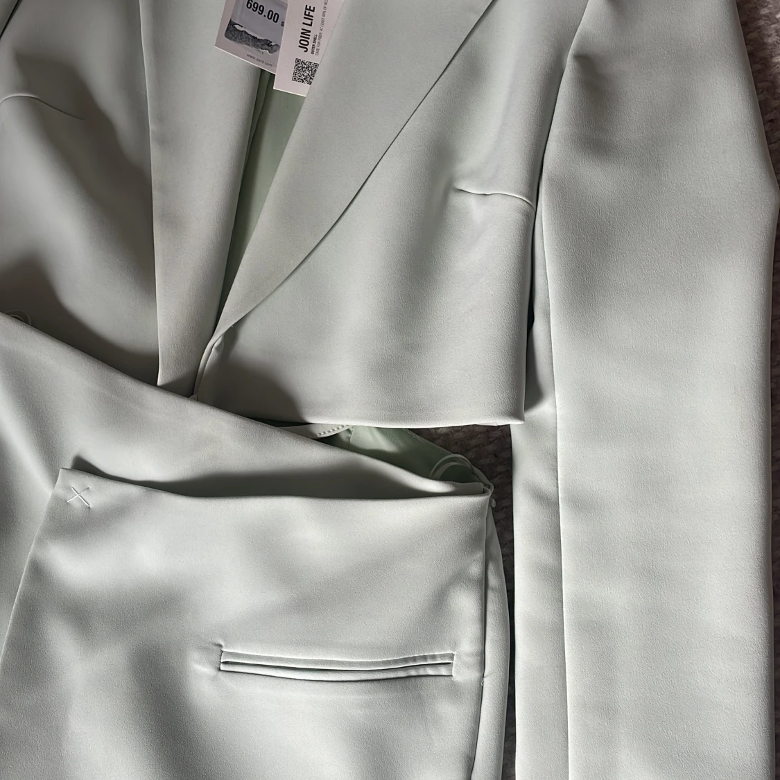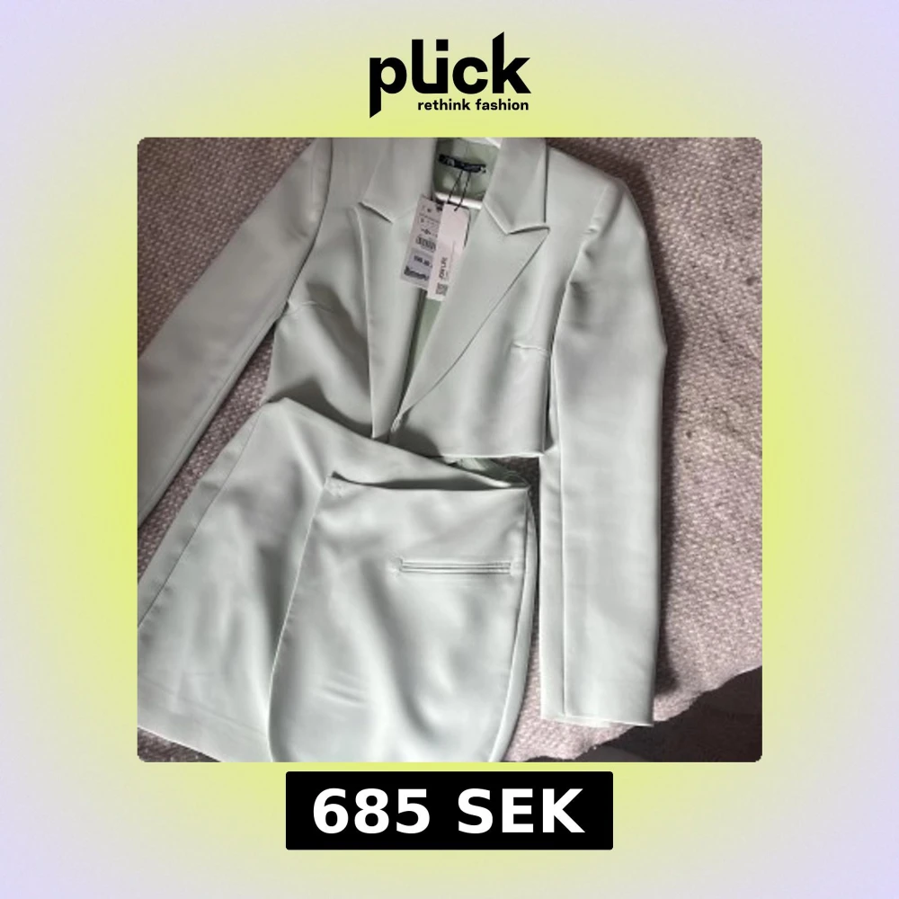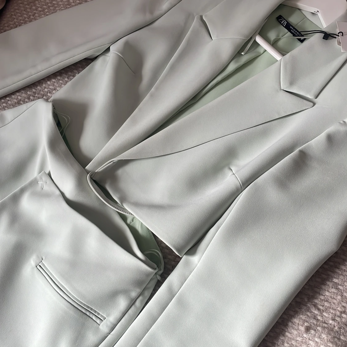 Snygg ljusgrön kostym från Zara med kavaj och matchande kjol som sitter ihop. Kavajen har klassisk krage och raka axlar, kjolen har en stilren design. Ger en mycket elegant och stilren look!!