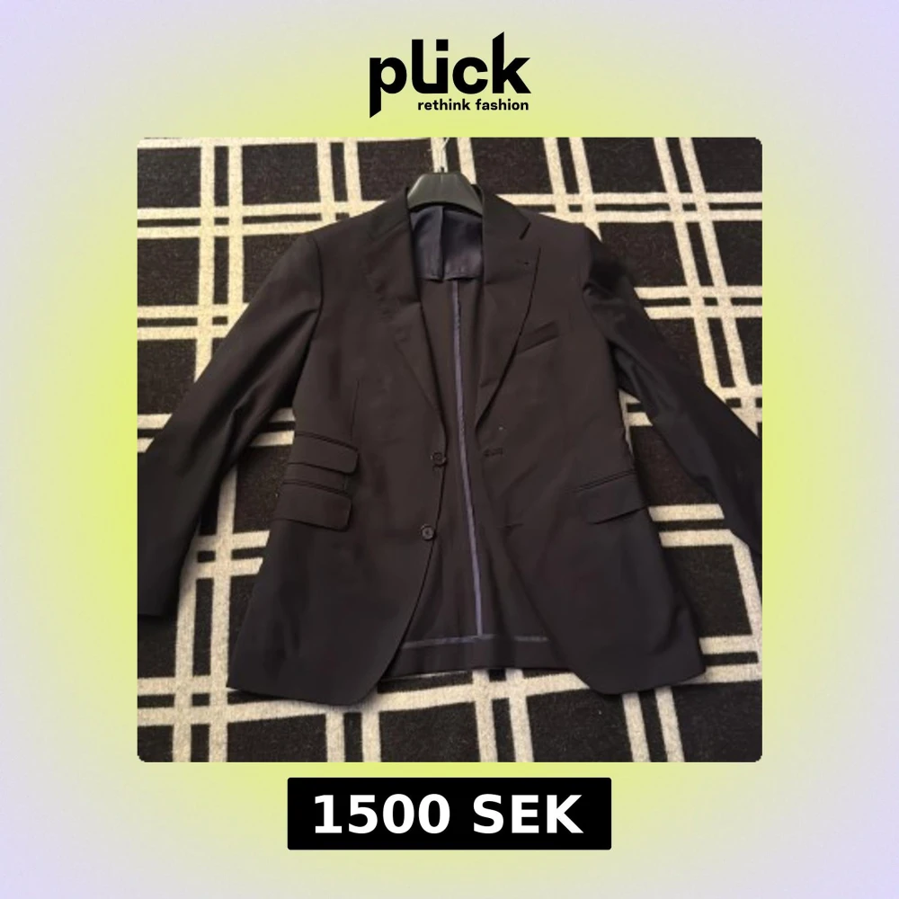 Stilren svart kavaj från Rose & Born, tillverkad i Italien. Klassisk modell med två knappar framtill, flera fickor med lock och slits baktill. Fodrad insida i mörk nyans. Storleken skulle beskrivas som en liten M. Perfekt för dig som vill ha en tidlös och elegant look.
