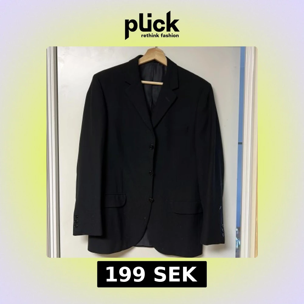 Elegant svart kavaj med klassisk design och tre knappar framtill. Perfekt för formella tillfällen. Kavajen har fickor med lock och knappar vid ärmsluten.