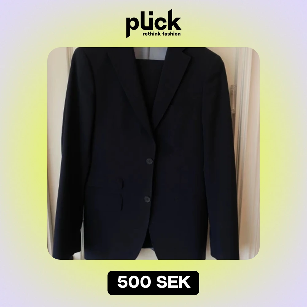 Mörk marinblå kostym i storlek 44, längd på byxa 100. Ord pris 4000kr, sparsamt använd. Liten sprucken söm vid vänster ficka.