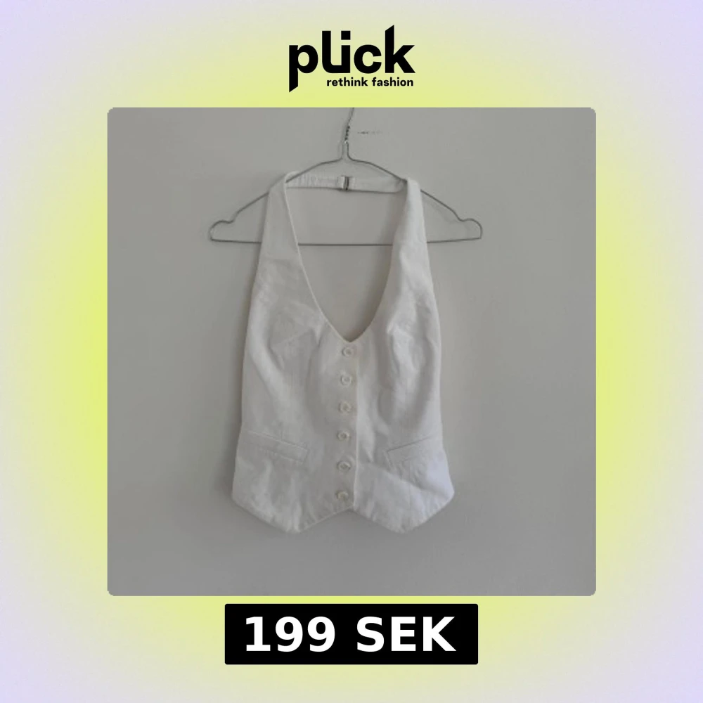 Säljer en stilren vit väst från Mango med djup v-ringning och knappar framtill. Västen har två dekorativa fickor och är figursydd för en snygg passform. Öppen rygg!