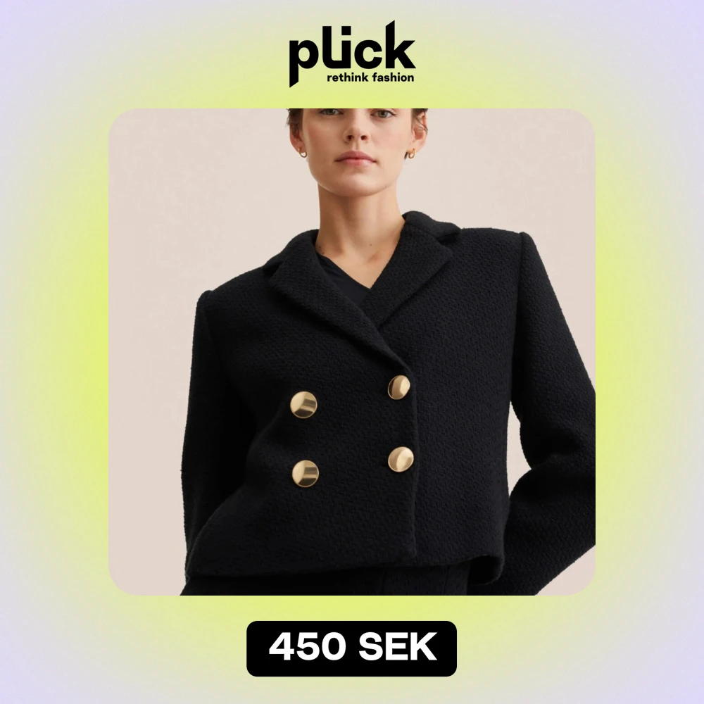 Dubbelknäppt kostym blazer Snygg svart kavaj med guldfärgade knappar. Kavajen är i en kort modell och har en dubbelknäppning. Den har en klassisk krage och långa ärmar. Tyg med bomull. Rak design. Kort design. Lång ärm knäppt. Kontrasterande v-ringn