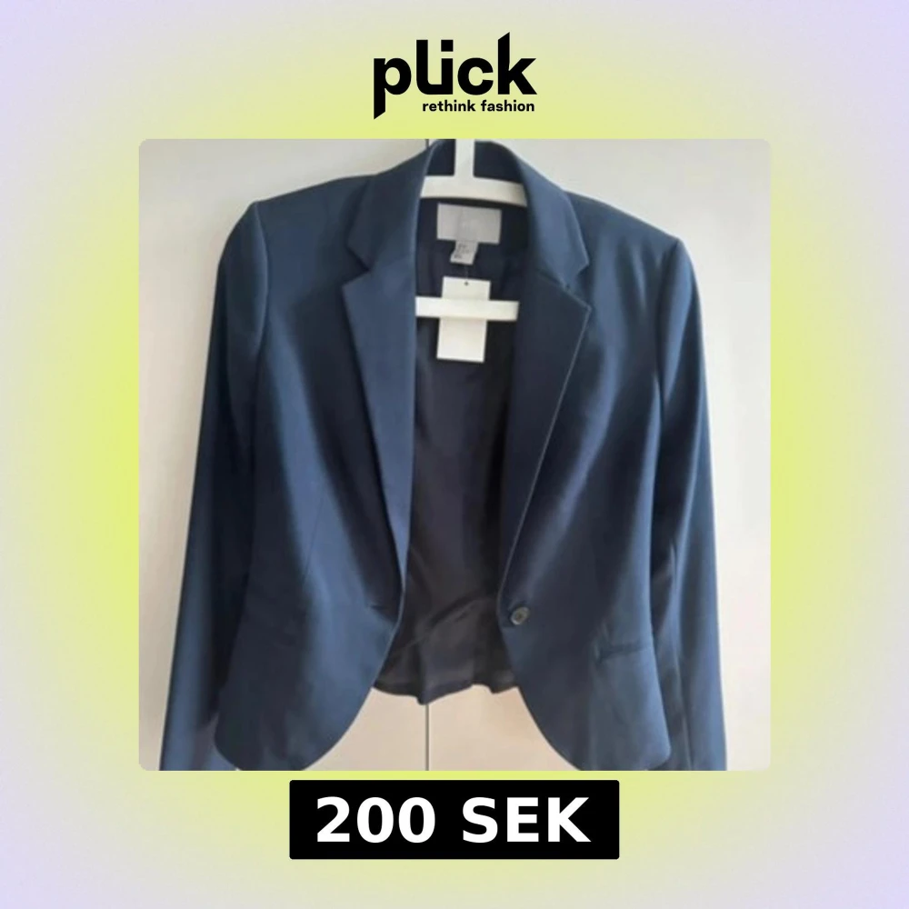Snygg mörkblå kavaj från H&M med klassisk krage och en knapp framtill. Figursydd modell med slät yta och diskreta fickor. Fodrad insida i matchande blått tyg. Perfekt för dig som gillar stilrena och enkla plagg