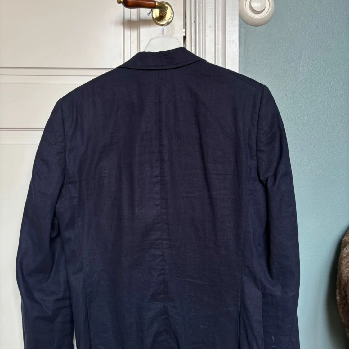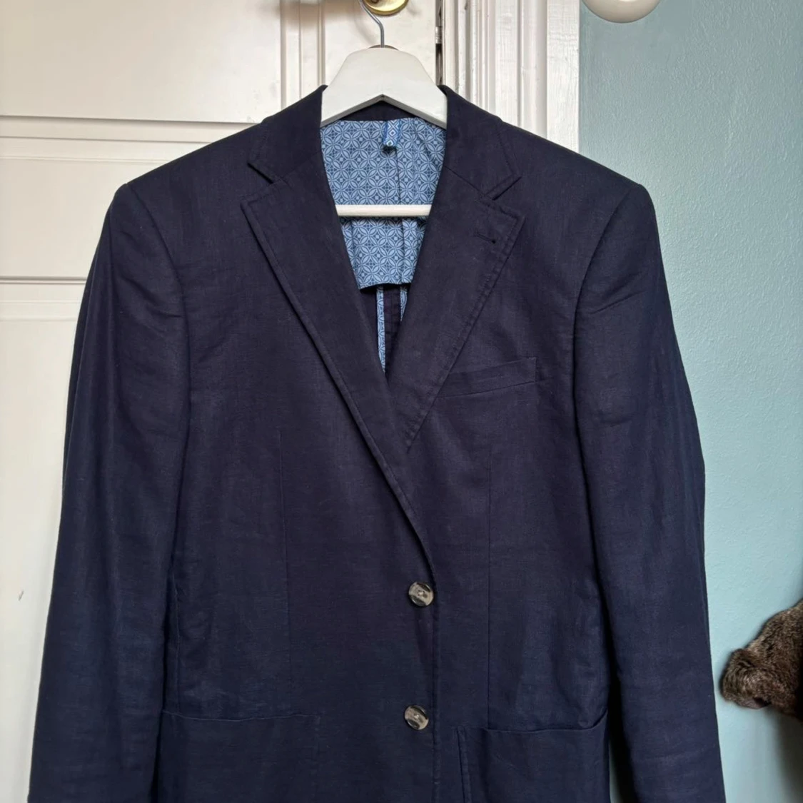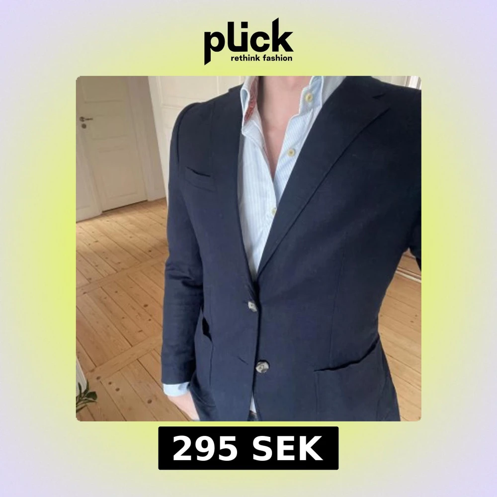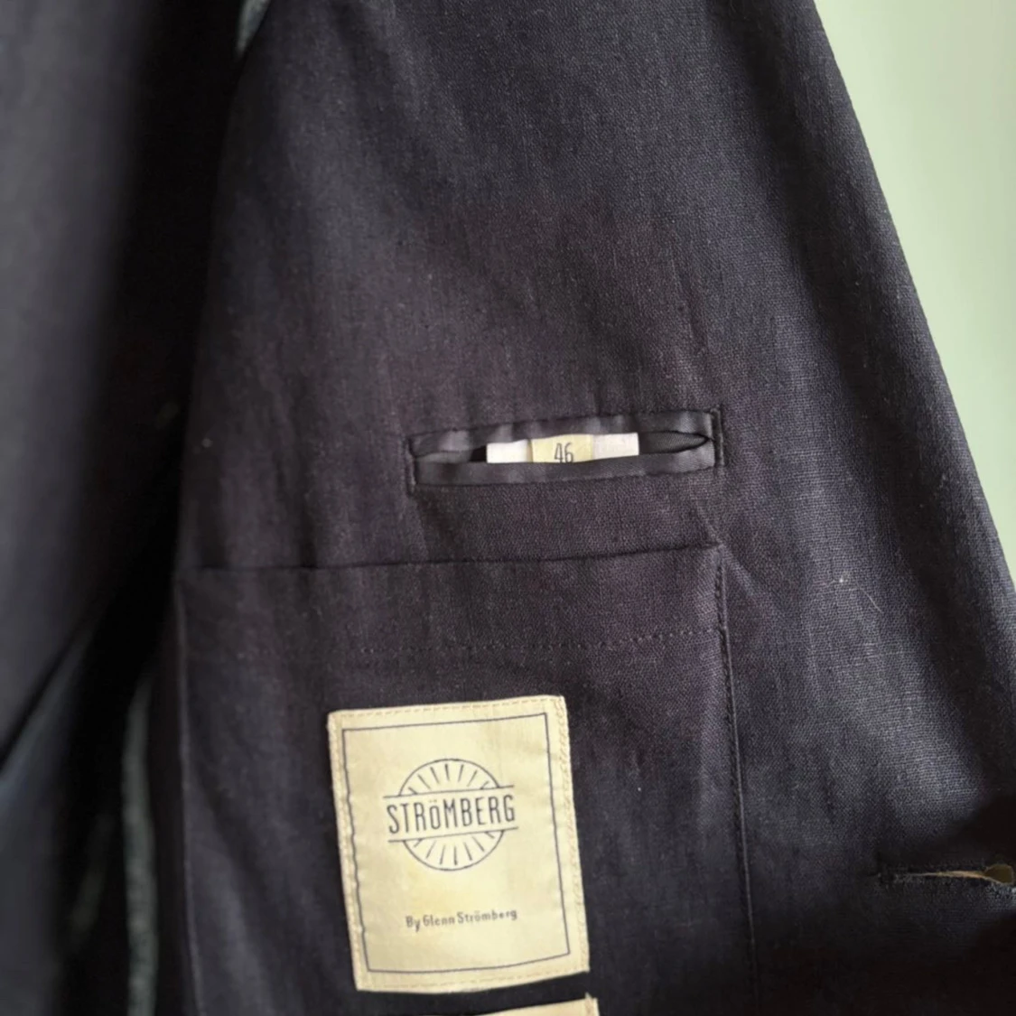 Snygg mörkblå kavaj från Strömberg med klassisk design. Fläck på ärmen som nog går att tvätta bort, har inte testat ännu. Storlek 46. Passar perfekt på sommaren och mindre formella tillställningar.