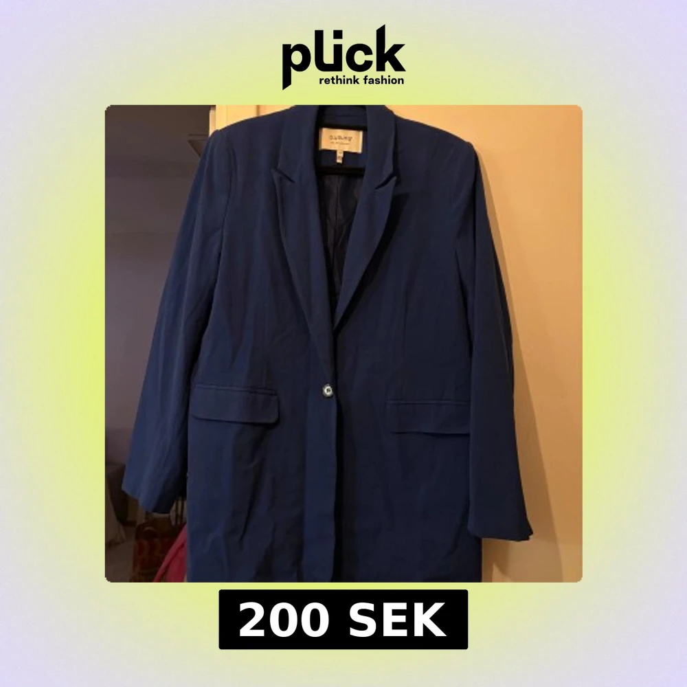 Mörkblå kavaj med klassisk design. Den är lite skrynklig pga att den legat ner packad i en låda, men det går lätt att fixa med steamer eller strykjärn.