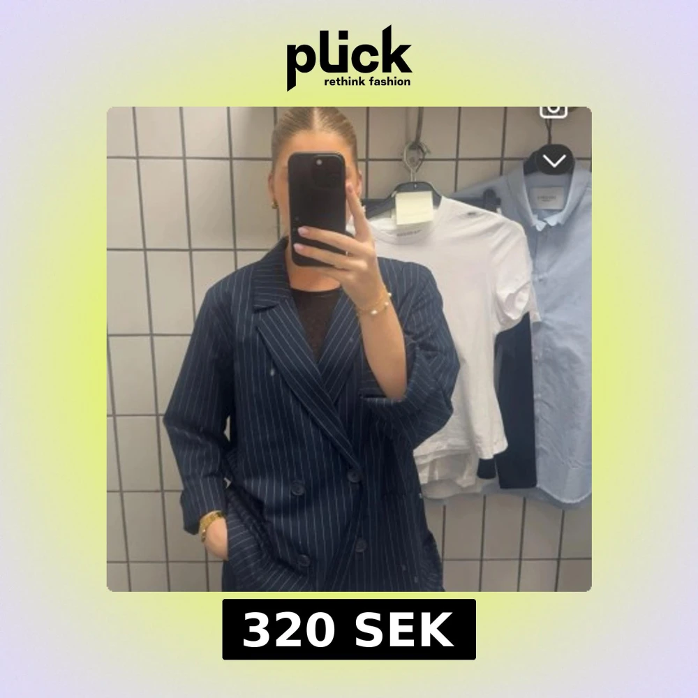 Säljer en mörkblå kavaj med vita smala ränder och dubbelknäppning. Kavajen har breda slag, två framfickor och en klassisk, rak passform. Perfekt för dig som gillar en stilren och trendig look.