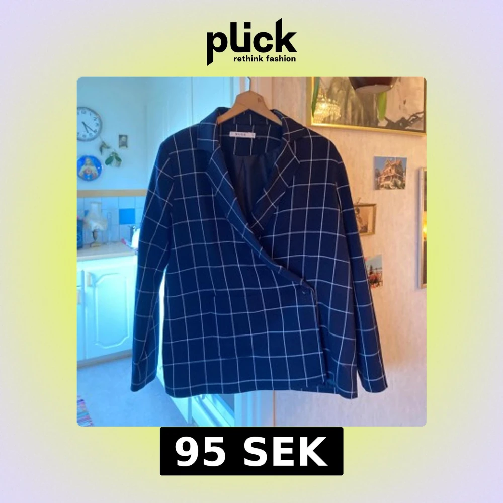 Snygg mörkblå kavaj från NA-KD med vitt rutmönster. Kavajen har en elegant omlott-design och långa ärmar. Knappt använd 🌷