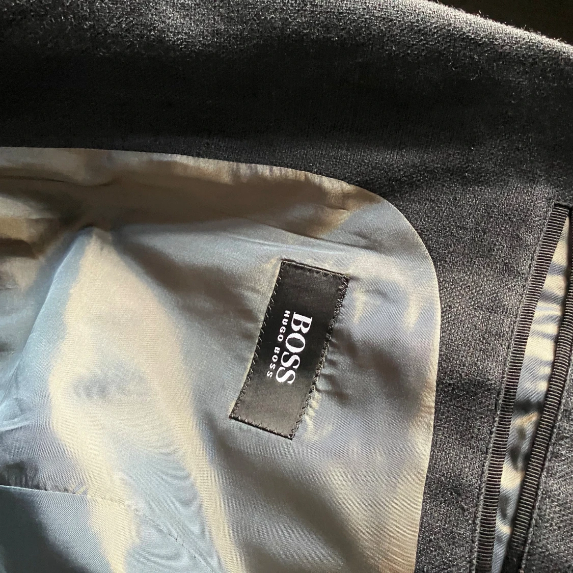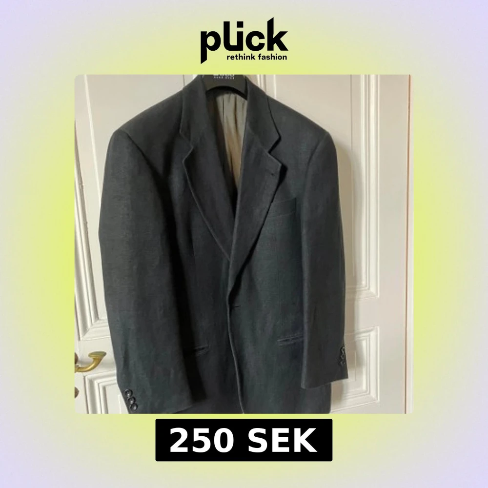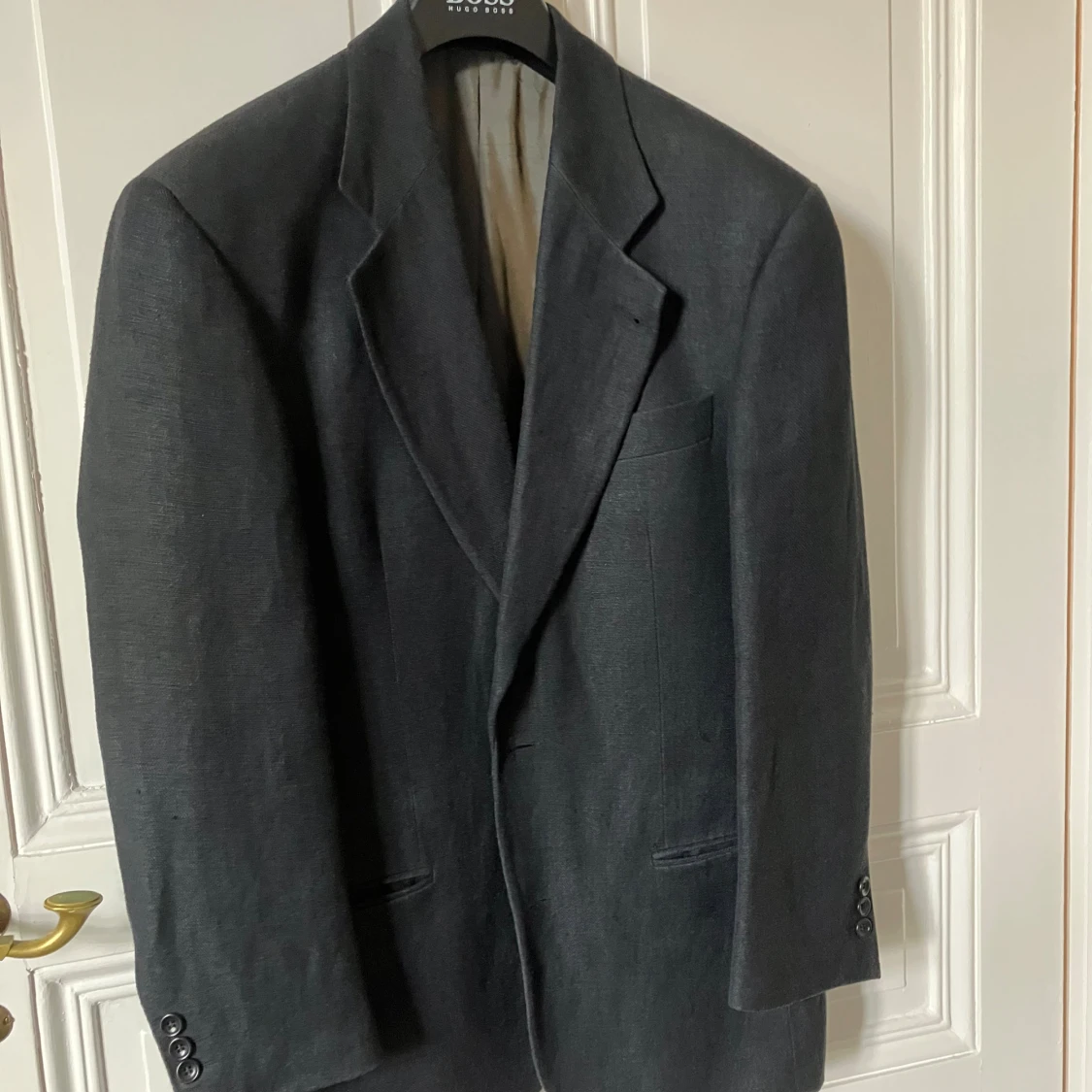 Snygg mörkgrå kavaj från Hugo Boss i modellen Maloma. Kavajen har klassisk passform med tre knappar vid ärmslut, bröstficka och två fickor framtill. Tillverkad i en blandning av linne och ull för en stilren och exklusiv känsla. Storleken är snarare 48-50 än 46.