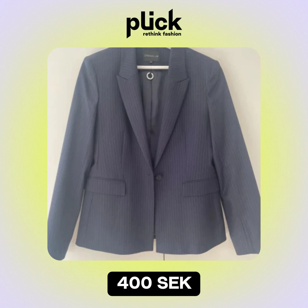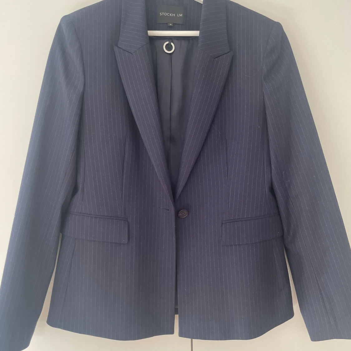 Kritstrecksrandig marinblå figursydd kavaj. Som ny