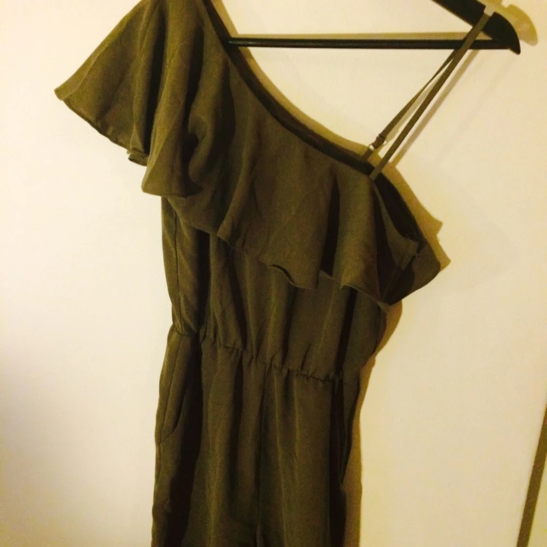 Olivgrön, lång byxdress med volang från HM. Använda ca 2 gånger. Matchande skärp tillkommer! Kan skickas emot fraktkostnad eller mötas runt om Stockholm! Priserna på alla mina saker kan diskuteras då jag vill bli av med allt!
