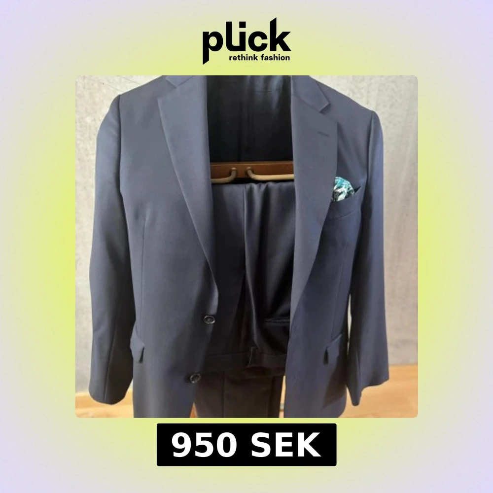 Snygg mörkblå kostym från Oscar Jacobson i klassisk modell. Kavajen har två knappar, spetsiga slag och en bröstficka med mönstrad näsduk. Byxorna är raka och dressade. Kostymen är tillverkad i ull och har en stilren look.