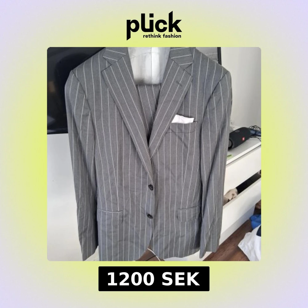 Snygg grå kavaj med vita vertikala ränder och klassisk passform. Kavajen har två knappar framtill, fickor med lock och en bröstficka med vit näsduk. Perfekt för en stilren och modern look komplett med väst och byxa