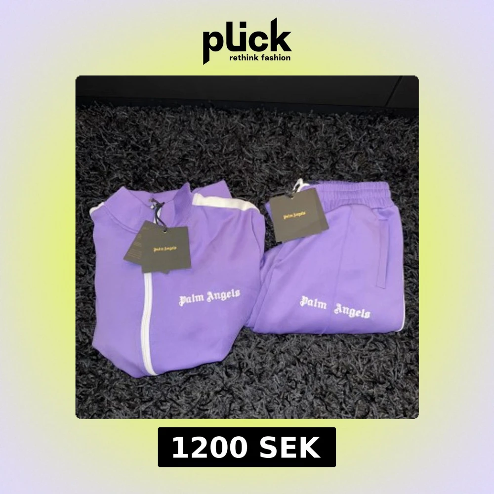 Säljer ett lila byxor från Palm Angels. Materialet är mjuk polyester och byxorna har resår i midjan. OBS: BARA BYXOR